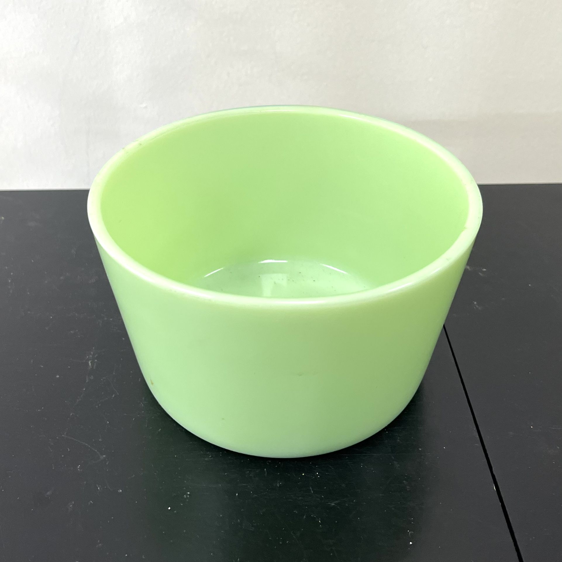 Bigger than a soup bowl smaller than a mixing bowl Perfect condition Unusual strait sides. Not curved Glowing milky green color