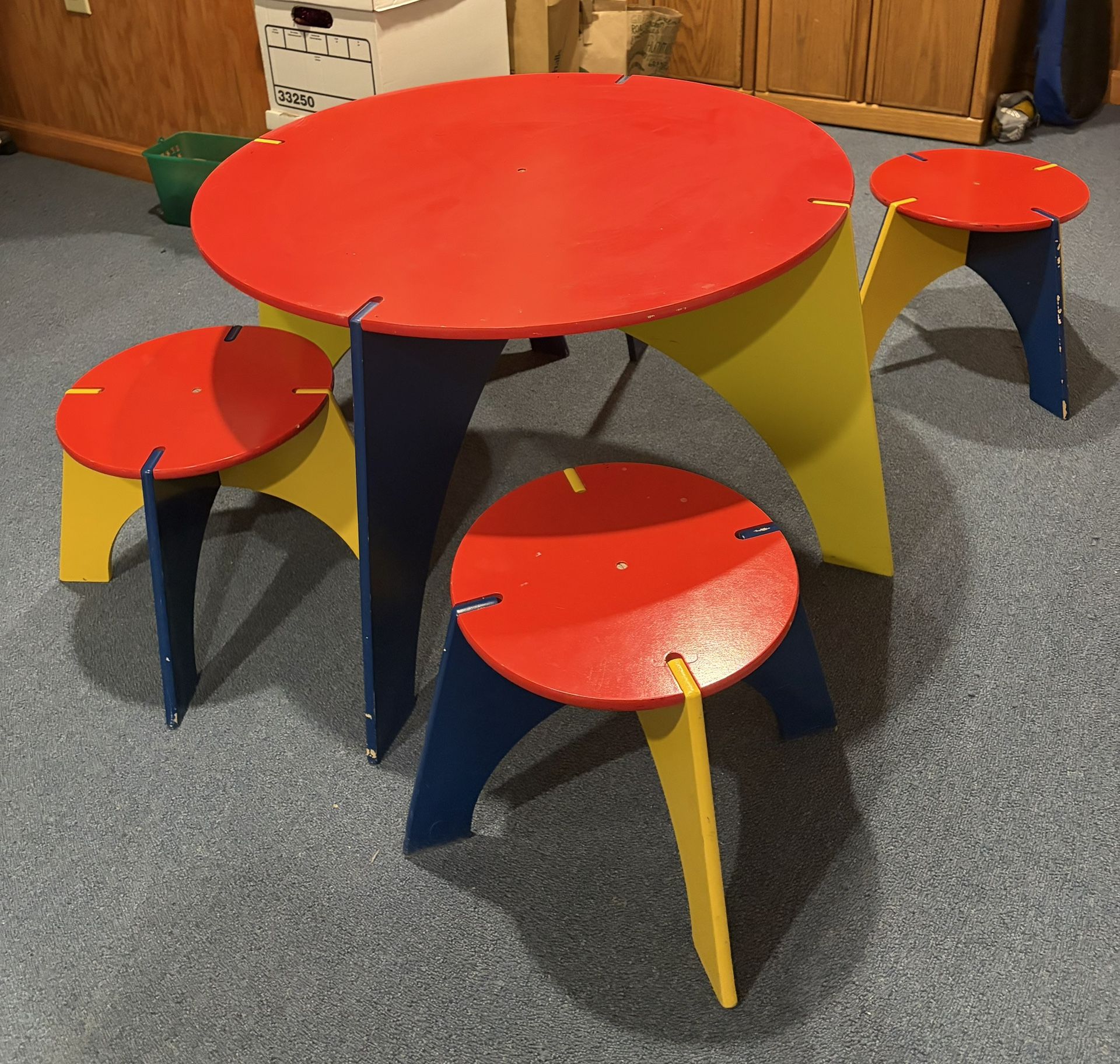 Bright red, yellow and blue table with matching stools.