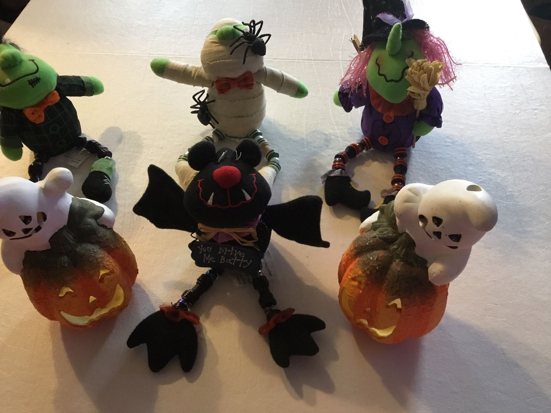 Halloween lot of 4 ghost ,mummy spider and witch. Shelf setters and a set of ghost and pumpkin candle holders