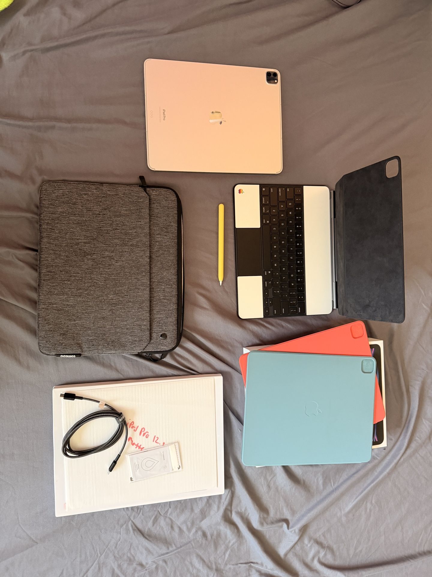 Used iPad Pro iPad Pro 12.9 6th gen M2 128GB Cellular in excellent condition, with the following accessories included: -Magic Keyboard with protective skin applied -Apple Pencil with sleeve -2 official Apple Smart Folio covers in orange and green -Carrying case -2 screen protectors (1 pre-installed already, 1 clear, and 1 matte) -charging cable -original box FIRM ON PRICE!!!! Everything is in excellent condition and was well taken care of :) please feel free to message me about any additional questions!