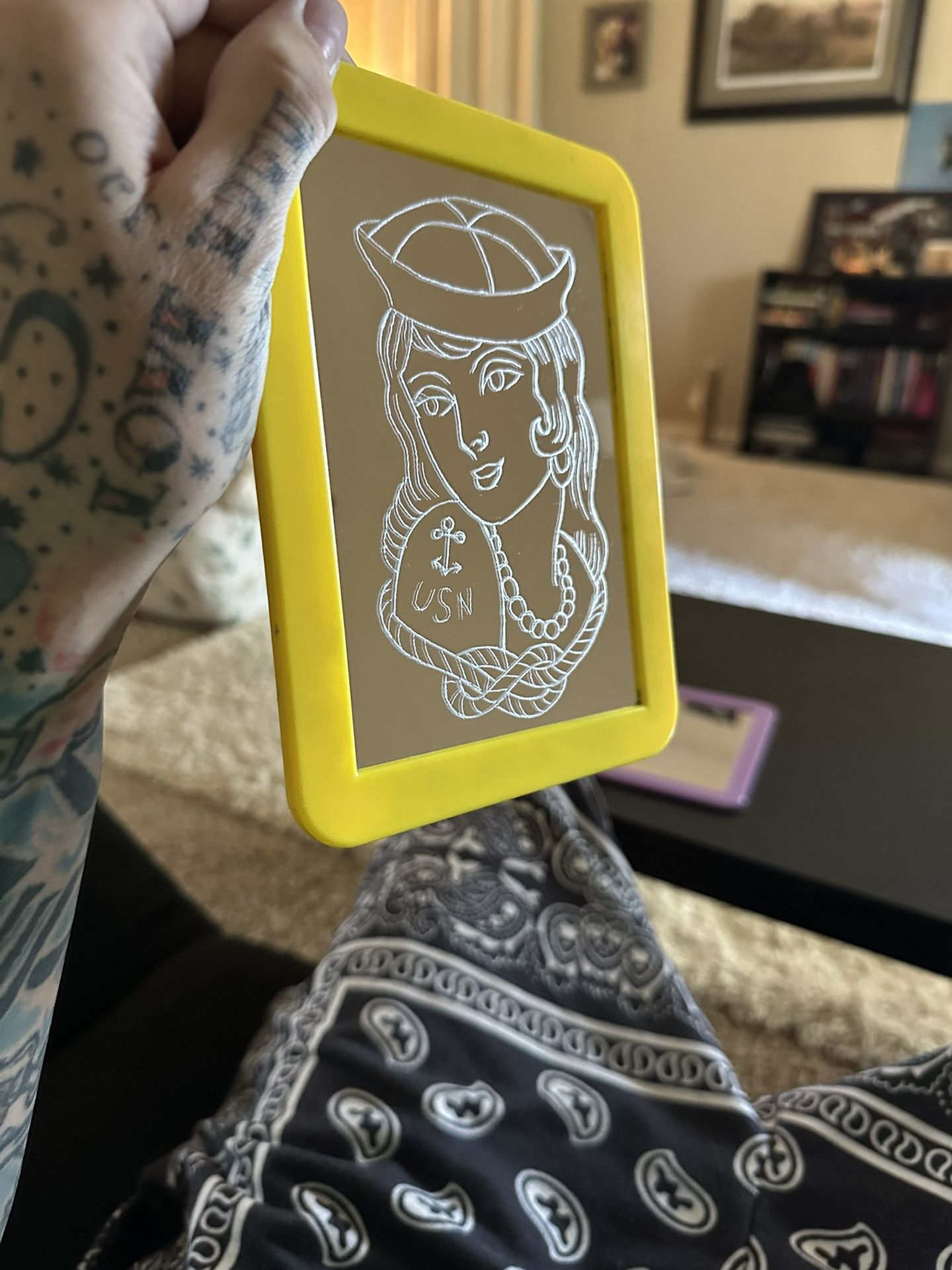 I have multiple locker mirrors with magnets on the back. I can do custom designs or sayings (lettering) or (poems) or (Love notes)… they are 7x5 inches… I have them in multiple colors royal blue, light blue, pink, yellow, white and purple… I’ve been a professional tattoo artist for 22 years and enjoy putting designs on mirrors. *ALSO* If you have a mirror of your own that you would like a custom design on, don’t hesitate to reach out just send me the image that you would like and a picture of the mirror that you have and we can go from there…!!