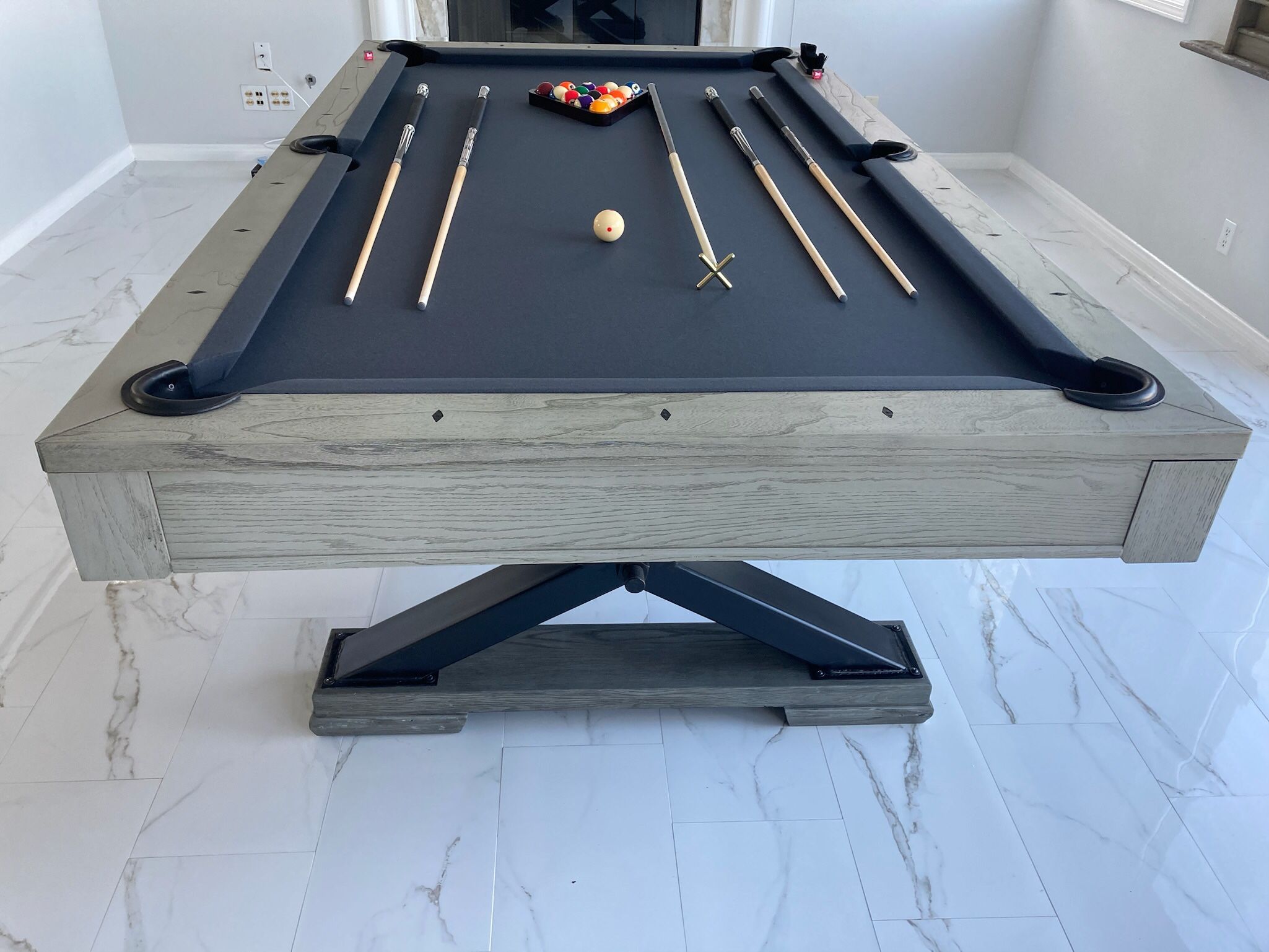 New Slate Top 3 piece 1 inch slate! Now $2850 all tables available in 7 feet or 8 foot (standard size) Available in 4 Different Solid Wood Finishes; black finish. Chocolate. Antique walnut finish & Grey stone finish. with black metal legs Add $500 for delivery & set up That will include first floor installation (upstairs is extra), your choice of felt color and a deluxe accessory kit. Total $3595 out the door tax included Retail is $5500. Also see our other pooltable ads, click on profile by picture to see other ads Also Available dining top. Turn your pool table into a dining table for just $975 additional! Text us with questions and place a phone order! No deposit required! $0. See it on delivery & confirm you love it! If you don’t, we’ll bring it back and you owe $0. Nothing owed!! Payment is due once we assemble, level the table & you’re 100% satisfied! Come see them in Person! We’re located in Mission Hills! Available by appointment! Or just place a phone order No deposit Needed!
