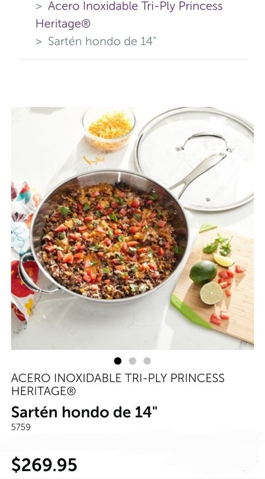 Hermoso sarten hondo con tapa Princess House. De 14" Acero Inoxidable Tri-Ply Princess Heritage $109.00 Nuevo
