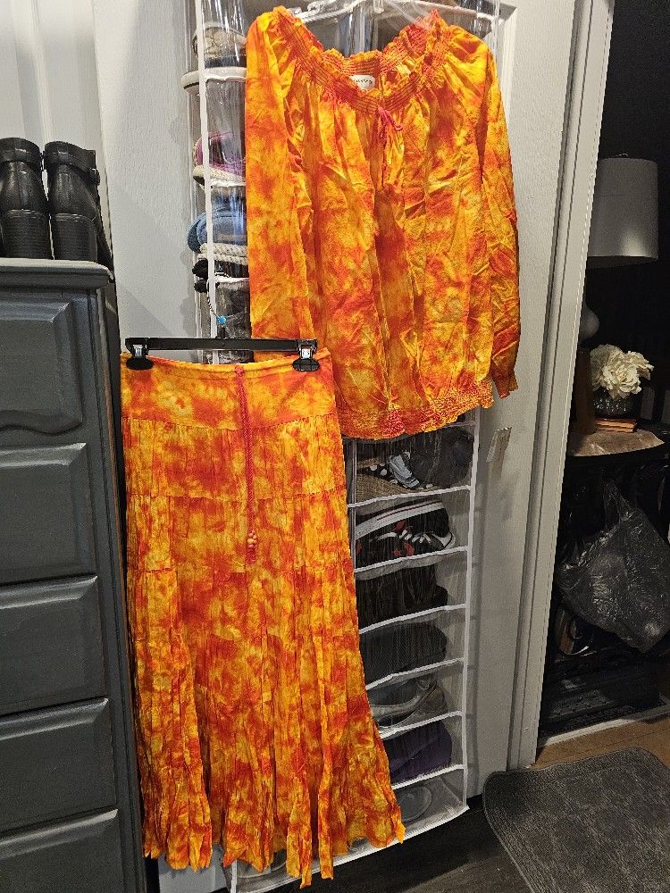 TWO PCS LADIES ORANGE AND YELLOW SKIRT SET SIZE LARGE LOCATED IN HIALEAH WE CAN MEET UP TO MAKE THE EXCHANGE ASKING 70.00 CASH ONLY NO TRADES PICK UP ONLY WE CAN MEET UP TO MAKE THE EXCHANGE (PRICE IS NEGOTIABLE)