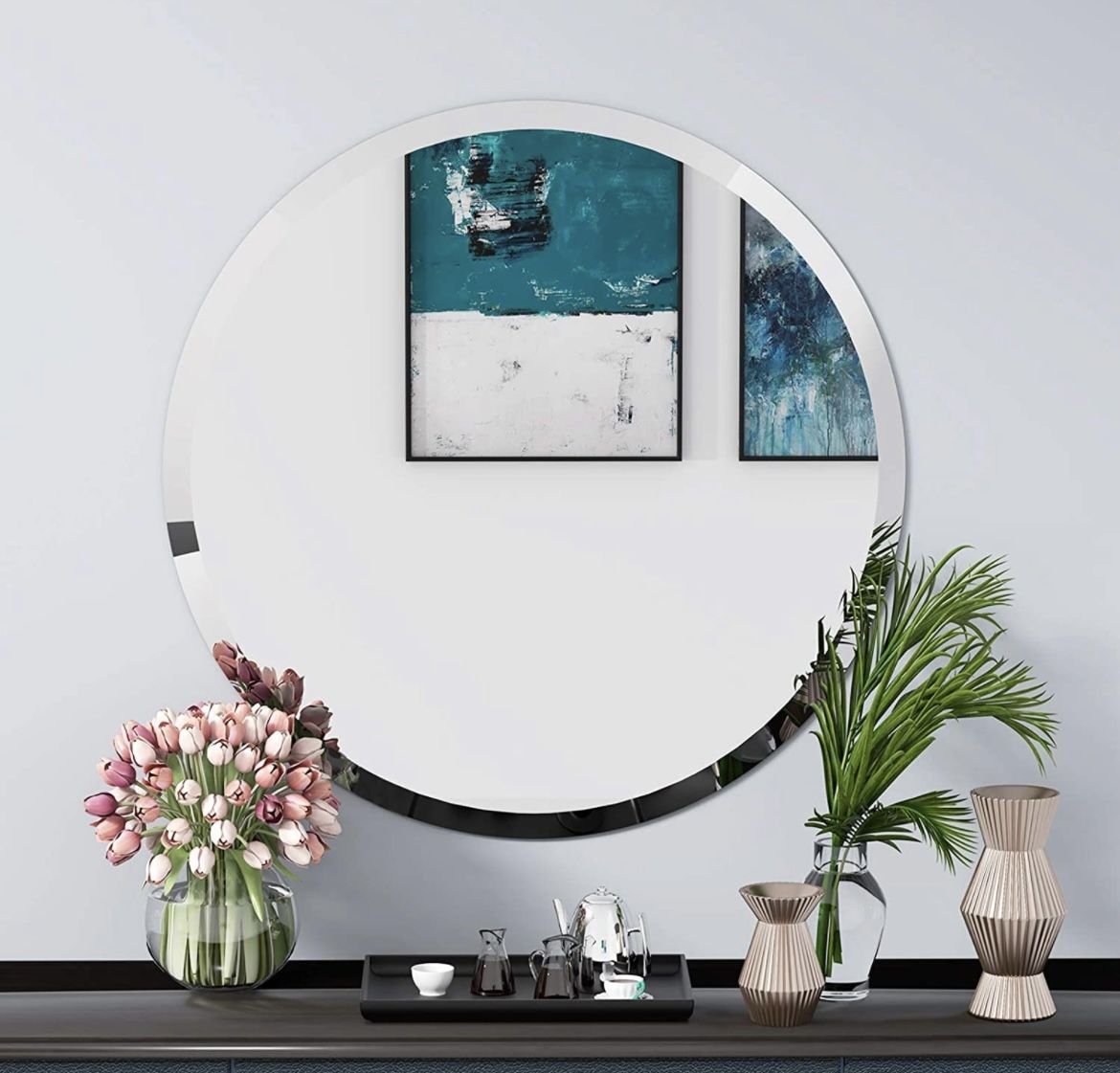KOHROS Round Beveled Polished Frameless Wall Mirror for Bathroom, Vanity, Bedroom (31.5" Round). Eye-Catching Design】 Classic, frameless, beveled edges, round design make this wall mirror so eye-catching. Sleek round mirror is a not only mirror, also be an adornment, making a personalized statement over any bathroom vanity, powder room or on any wall in your home. 【Perfect Touch】The smooth edges of living room mirror are hand polished to ensure safety and beauty. As a reflective surface, give room a better sense of light and space. The decor wall mirror can be hung horizontally and vertically, either way the large wall mirror will create a wonderful illusion of increased space. 【HD Imaging】All mirror use high-end 4mm thick silver glass mirror, which provides a clear distortion-free reflection, and eliminate the common reflective distortion of low-end mirrors. The mirror's clear image gives you the best visual experience. 【Safety Packaging】 Using a very professional packaging method. First packed the mirror in a clear PE bag to ensure that there will be no stains during transportation. Then, using customized reinforced 5cm foam block and 1cm master box. Pass a rigorous 12 point drop test at 30in height. Make sure that the frameless wall mirror can be delivered safely to our customers.