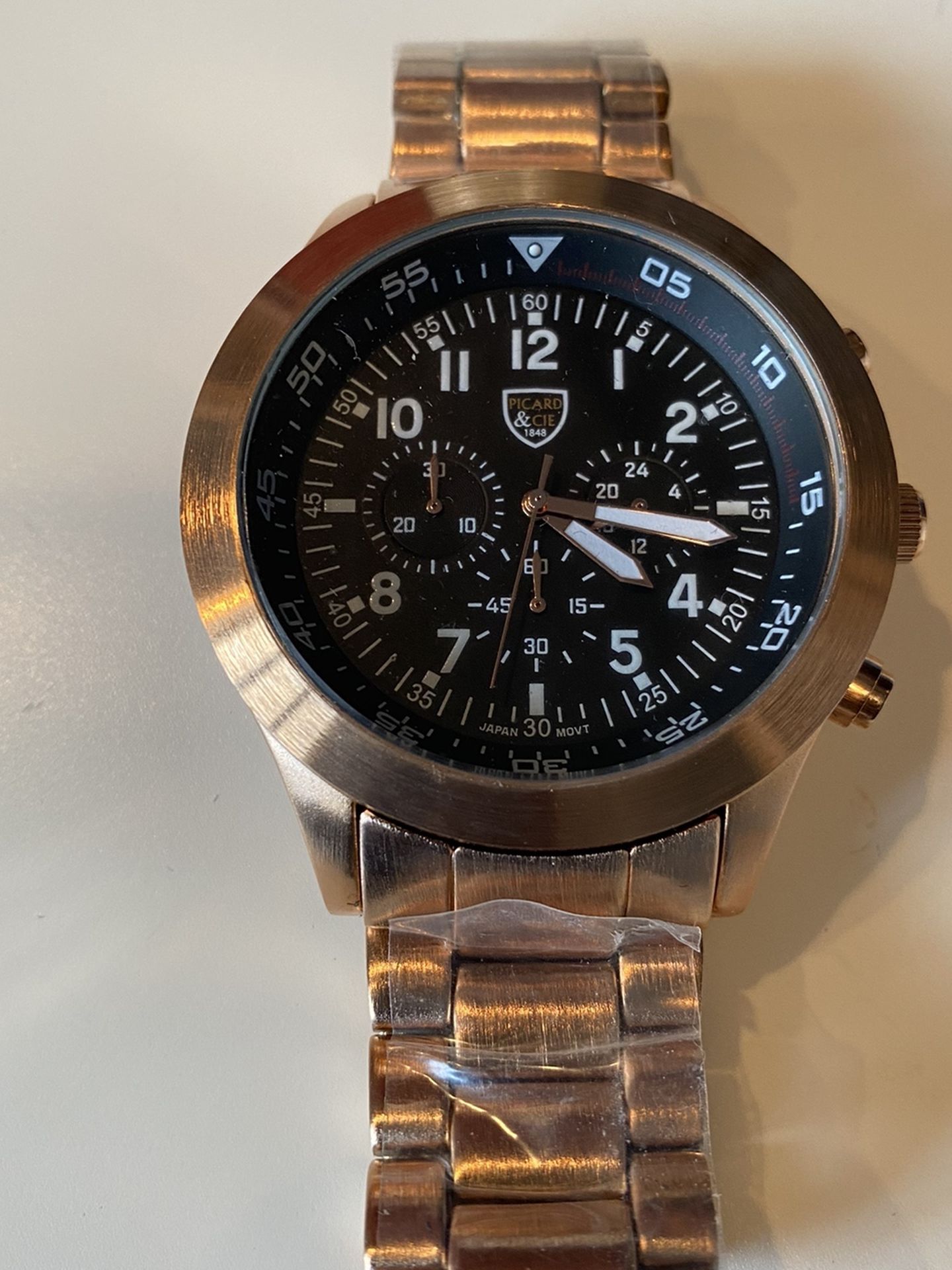 * Analog display * Miyota JS20 quartz movement * Case material: base metal * Case-back material: stainless steel * Case dimensions: 49mm (W) x 14mm (H) * Bezel material: base metal * Bezel color: gold, silver, or black * Bracelet material: ion-plated metal * Bracelet dimensions: 153mm (L) x 23mm (W) * Clasp type: stainless steel safety clasp * Textured dial with dynamic layout * Chronograph complications * 60-second, 30-minute, and 24-hour subdials * Push/pull crown * Water resistant to 30 meters * Approx. full product dimensions: 153mm (L) x 49mm (W) x 14mm (H)