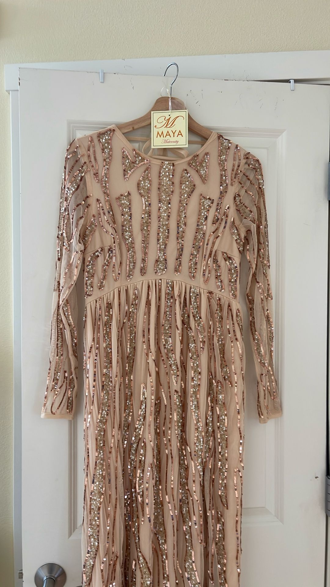 Beautiful gown can be worn as maternity or regular , cute slit on the side I wore once for my maternity shoot Smoke free pet free home Lays so beautifully on !!!!!