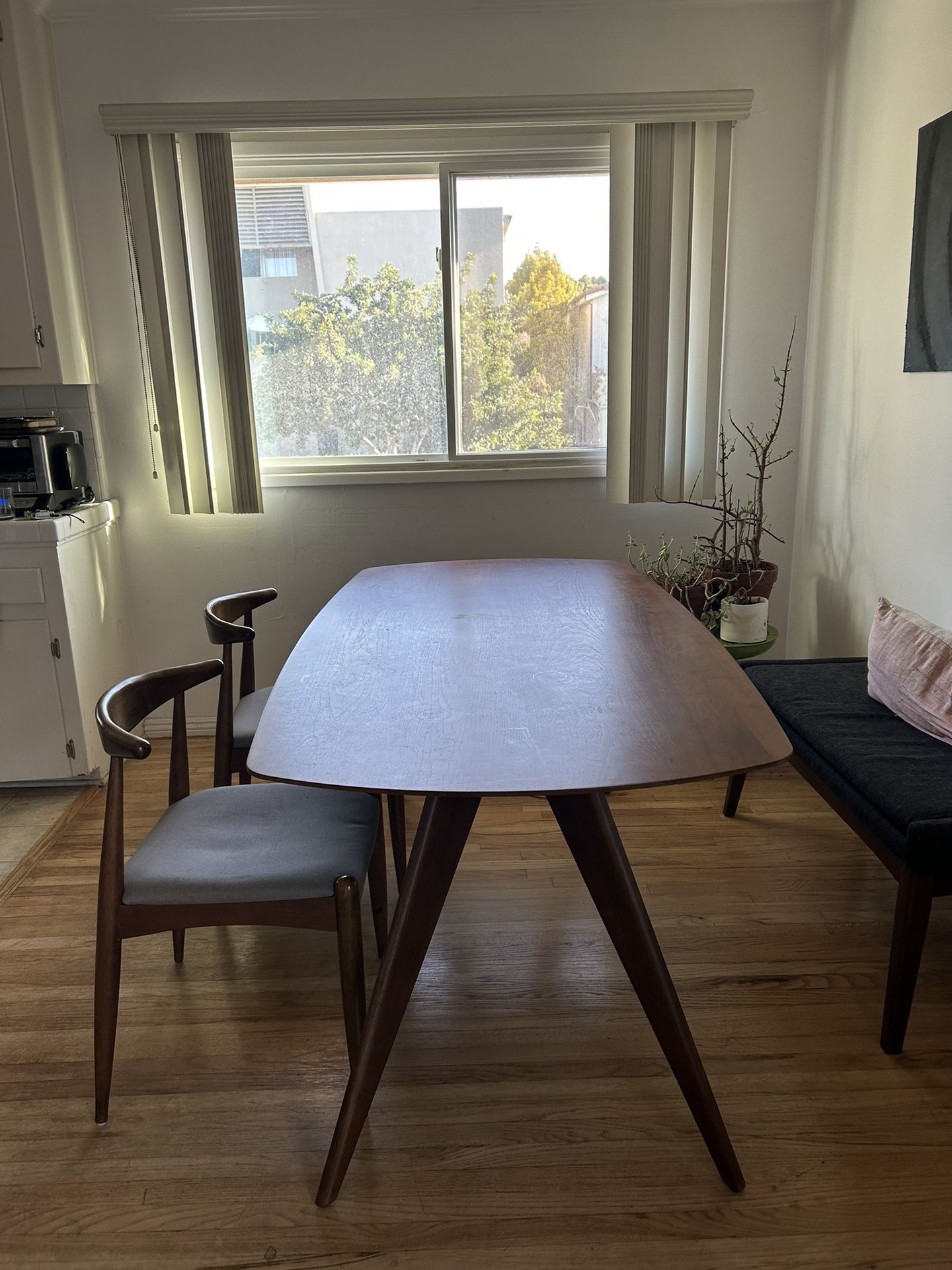 Olea Article walnut Dining Table! In impeccable shape, a few wear and light scratches but really beautiful modern table. Original price $699. Danish style design Dimensions: Length 71 x width 36 x height 30.5 Chairs/Bench not included!
