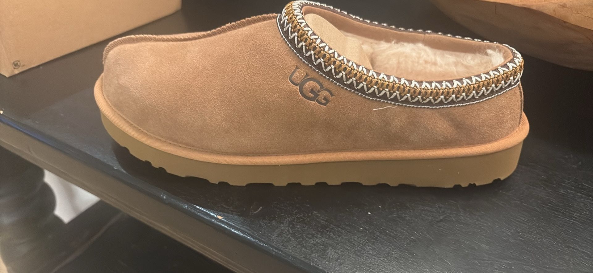New with box. Chestnut color. Ordered wrong size and can’t return. Heavily discounted. Located near Tatum and 44th street. Manufacturer description: The Ugg Men's Tasman offers a blend of classic design and exceptional comfort. Featuring premium sheepskin lining, these slippers provide natural insulation for year-round wear, keeping feet warm in winter and cool in summer. Their lightweight suede upper and durable rubber outsole ensure long-lasting wear with reliable traction. Ideal for indoor and outdoor use, the Tasman combines cozy comfort with versatile functionality, making it a dependable choice for everyday casual wear.
