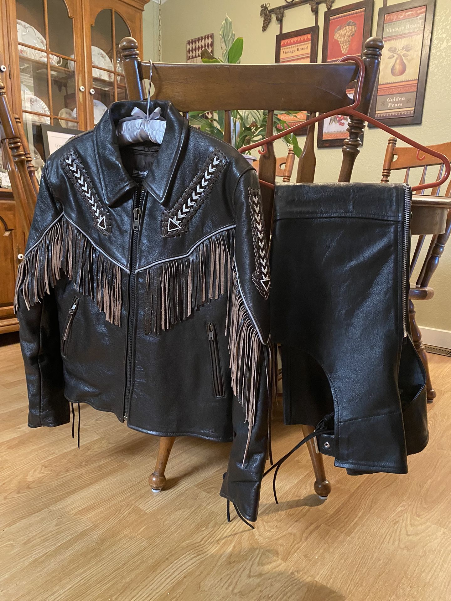 Beautiful woman’s leather motorcycle jacket with zip out lining. Excellent condition, hardly used. Nice and warm ! Leather chaps, excellent condition. Both size medium . ****Local pick up only**** Hemet area. No shipping on these items I will delete post when items are purchased .