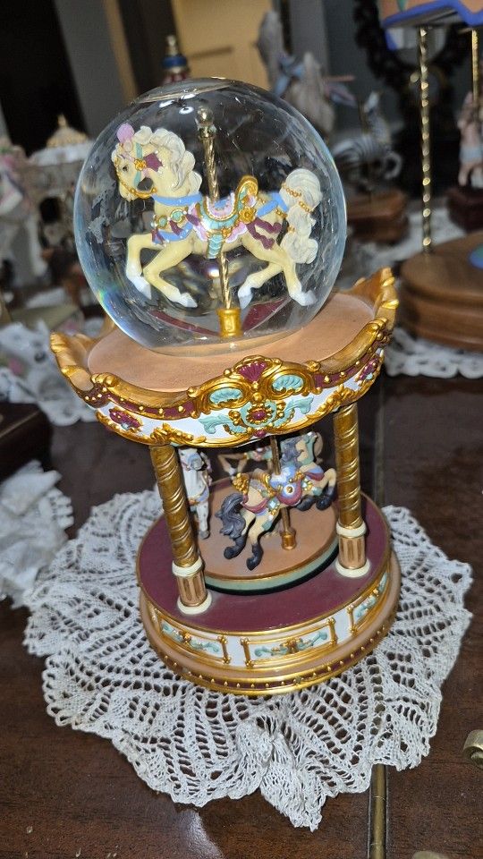 It features three exquisitely carved horses circling on an ornate resin base. A clear glass globe holds a white carousel horse amid swirling iridescent glitter. The globe plays the classic "Carousel Waltz" tune. It stands approximately 9 inches tall.