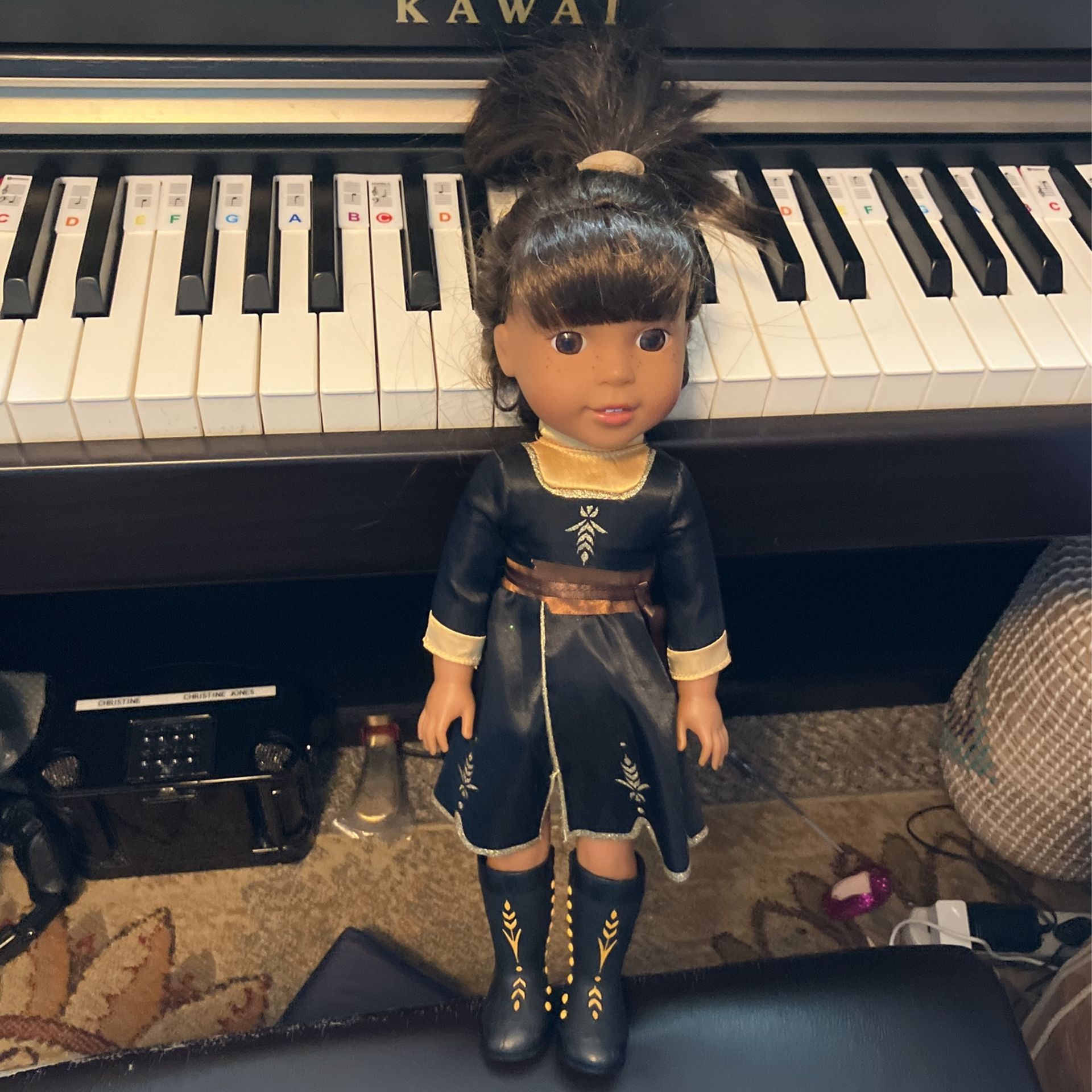 Pretty little American beauty with black silk dress with gold trim and matching boots Buyers will be responsible for shipping.