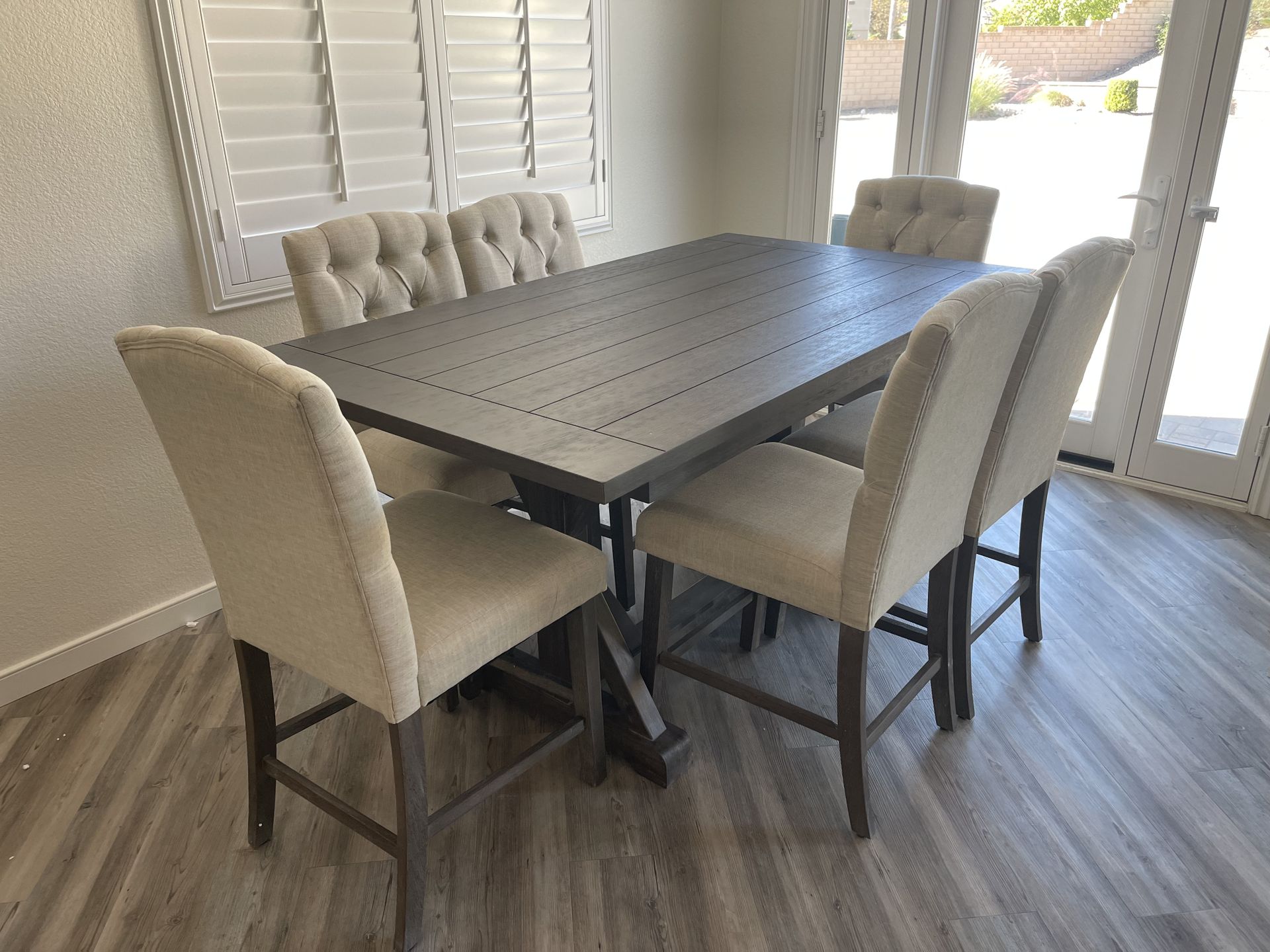 Counter Height Dining Table Rustic wood plank style table with trestle base Dimensions: 78x38x36H 6 Beige Upholstered counter height chairs with thick padded seats, elegant button tufting, solid wood legs and studded trim CLEARANCE SALE!!! TIL supply’s last Regular $1200 On SALE Now ONLY $699 Everything Comes Brand New Delivery Available Please check out all my offers Ready to buy? Contact me direct (951) 251-2983 Follow my IG @Furniture.Boss Thanks for reading my ad