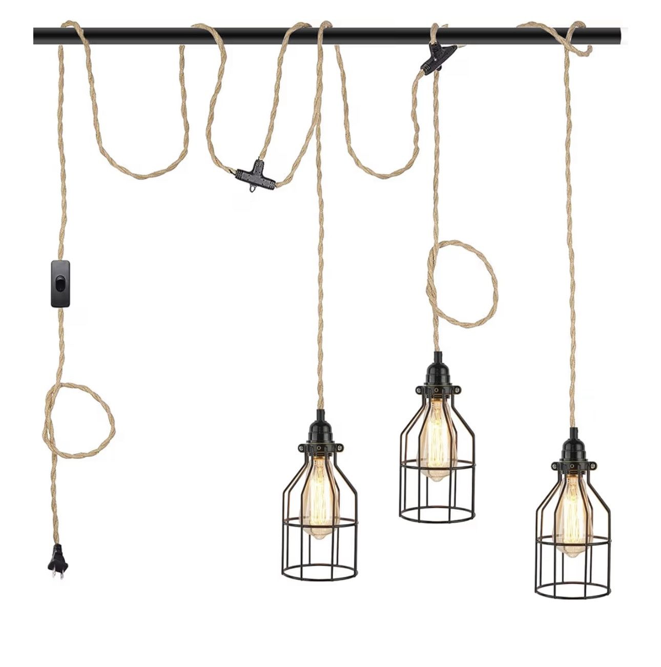 3 Light Triple Hanging Light with Plug in Cord Plug in Pendant Light 27ft Hemp Rope Pendant Lighting