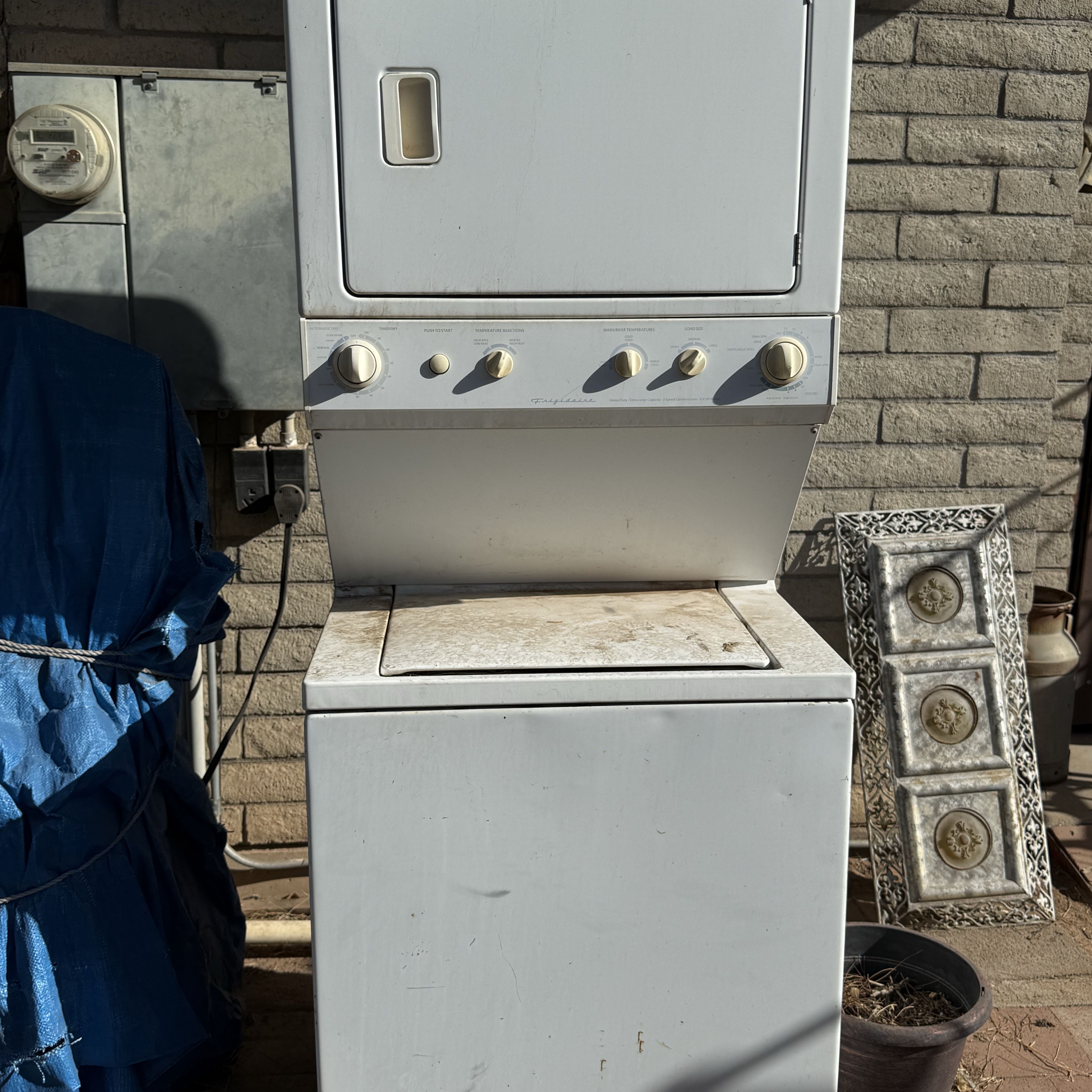 White stacked washer and dryer unit with control knobs and top-loading design. Metal construction with separate compartments for washing and drying.