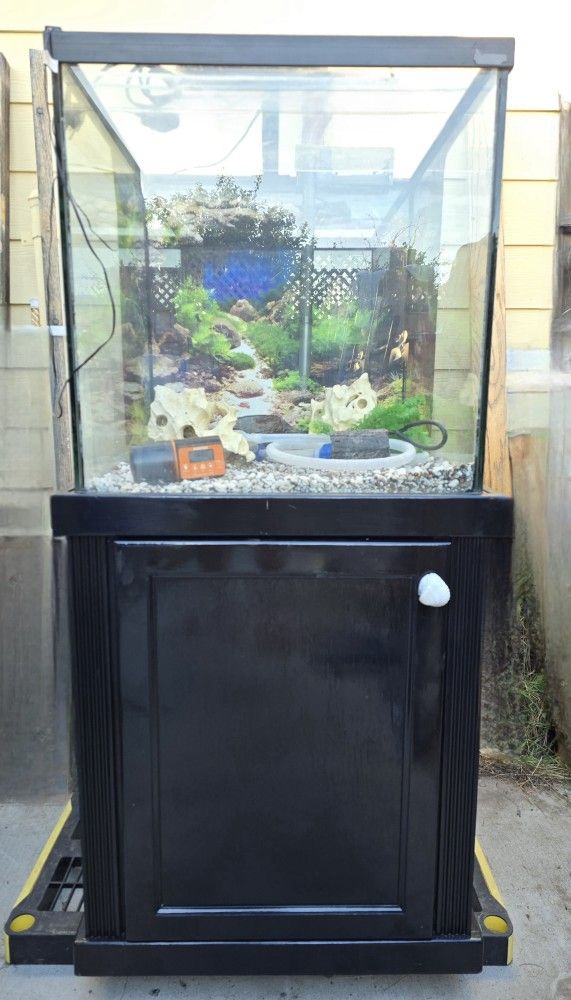 BEAUTIFUL EXTREMELY RARE 60 GALLEN GLASS AQUARIUM. MEASUREMENTS OF THE TANK ARE 24x24x24 THE HEIGHT OF THE TANK ON THE STAND IS, 55 INCHES HIGH. COMES WITH EVERYTHING EXCEPT I REPORT I DROPPED THE HEATER AND BROKE IT.. YOU CAN PICK ONE UP ON AMAZON FOR ABOUT 25.00. SHOULD BE AT LEAST A 200 WATT WHICH IS WHAT WE HAD RUNNING IT. COMES WITH A BACK FILTER WITH NEW CLEAN INSIDES, GRAVEL A PLANT, A GRAVEL VACUUM AND A AUTOMATIC FEEDER. THE LIGHT IS NOT LED WHICH IS ALSO HARD TO FIND THESE DAYS. IT'S JUST AS BRIGHT THOUGH. THE STAND IS SOLID WOOD AND IT WAS CUSTOM MADE FOR THE TANK. ALSO COMES WITH A YELLOW BUCKET AND LID. ALSO COMES WITH A CUSTOM SCREEN LID THAT WAS MADE FOR THIS AS WE USED IT FOR A IGUANA TEMPORARILY. THE STAND HAS A LITTLE SHELF UP INSIDE. WE'RE ASKING $100.00 CAN'T FIND THIS SIZE ANYMORE. NO LEAKS NEVER HAS. MEETING PLACE IS A SHELL GAS STATION OFF OF THE SEAWORLD DRIVE EX. 1330 MORENA BLVD 92110. SORRY NO PAYPAL OR VENMO CASH ONLY.