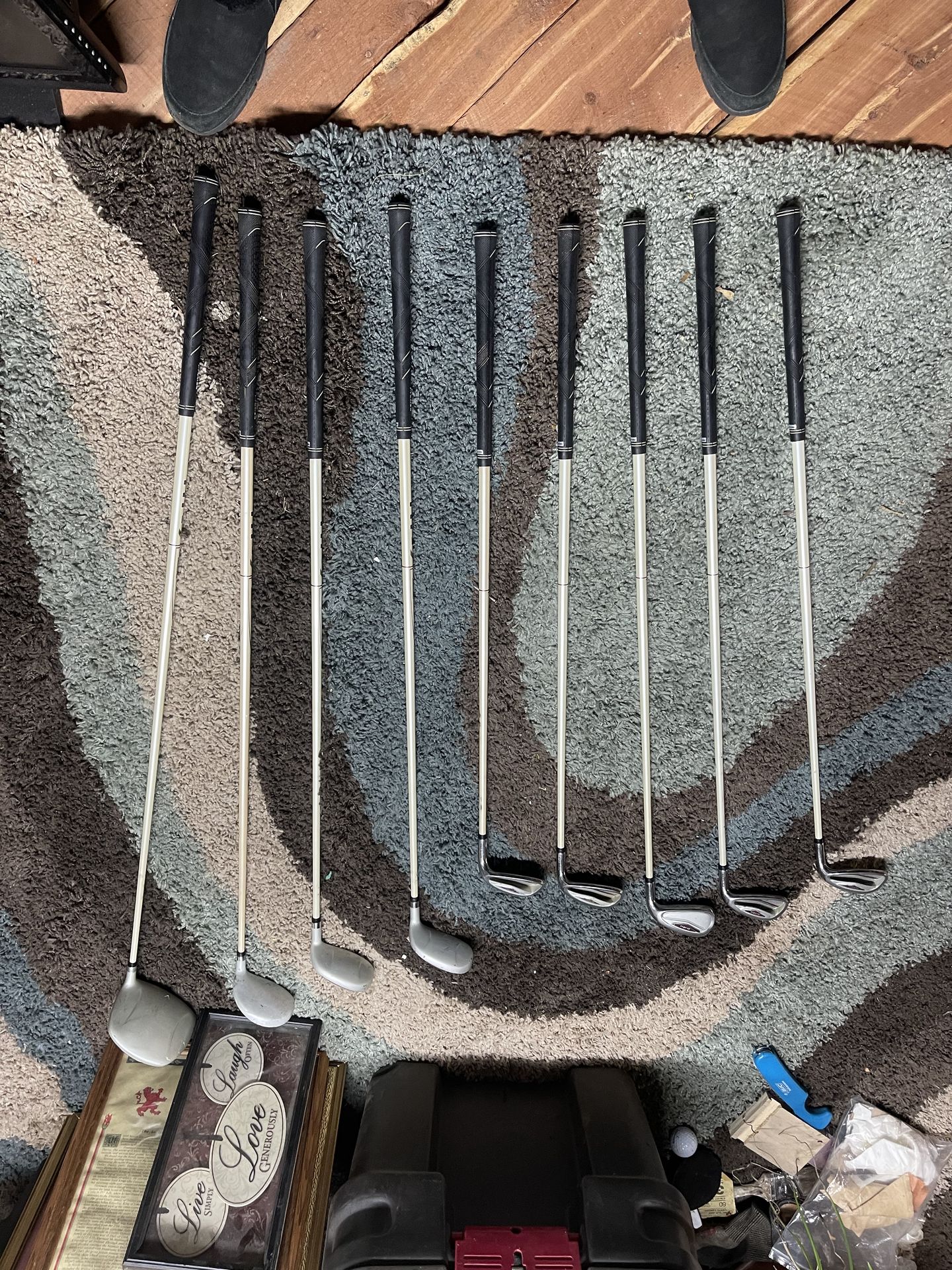 Driver, 3,4,5 hybrid woods, 6,7,9 irons, & P&S wedges.