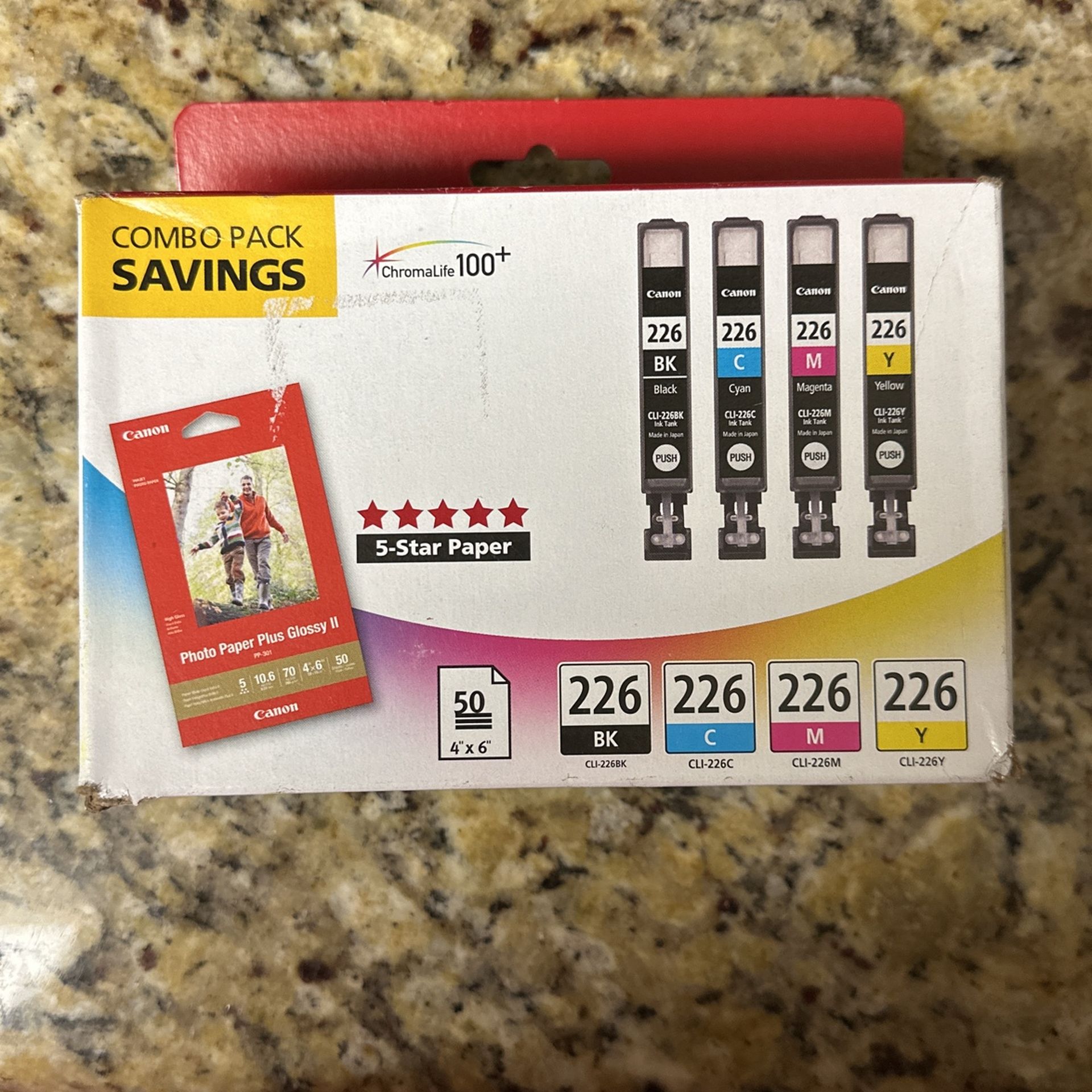 Canon CLI226 Color Pack with Photo Paper 50 Sheets Compatible to iP4820, MG5220, MG5120, MG6120, MG8120, MX882, iX6520, iP4920, MG5320, MG6220, MG8220, MX892 Contains one of each CLI-226 Black, Cyan, Magenta, Yellow and a 50 sheet pack of Photo Paper Plus Glossy II Genuine Canon Ink and paper for quality and reliability Save money, have extra ink and paper when you need it with a combo pack These inks offer amazing color gamut and color fastness. Individual Ink Tank System increases efficiency.