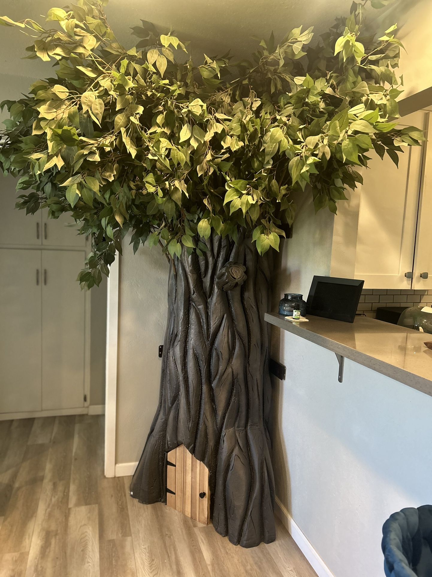 This is a brand new, custom, one-of-a kind faux tree. The tree trunk is hand carved and painted with traditional ficus foliage as the leaves. The tree trunk is 8’ tall and about 2’ wide. The photos of it are in an 8’ tall room. Originally custom made to be part of an Alice in Wonderland Airbnb. However, we have decided to switch to long term renters instead of opening up a short term rental. This price is firm, as it is a custom, brand new tree. I spent close to 6k on this tree. Otherwise I will keep it in my kids nursery.
