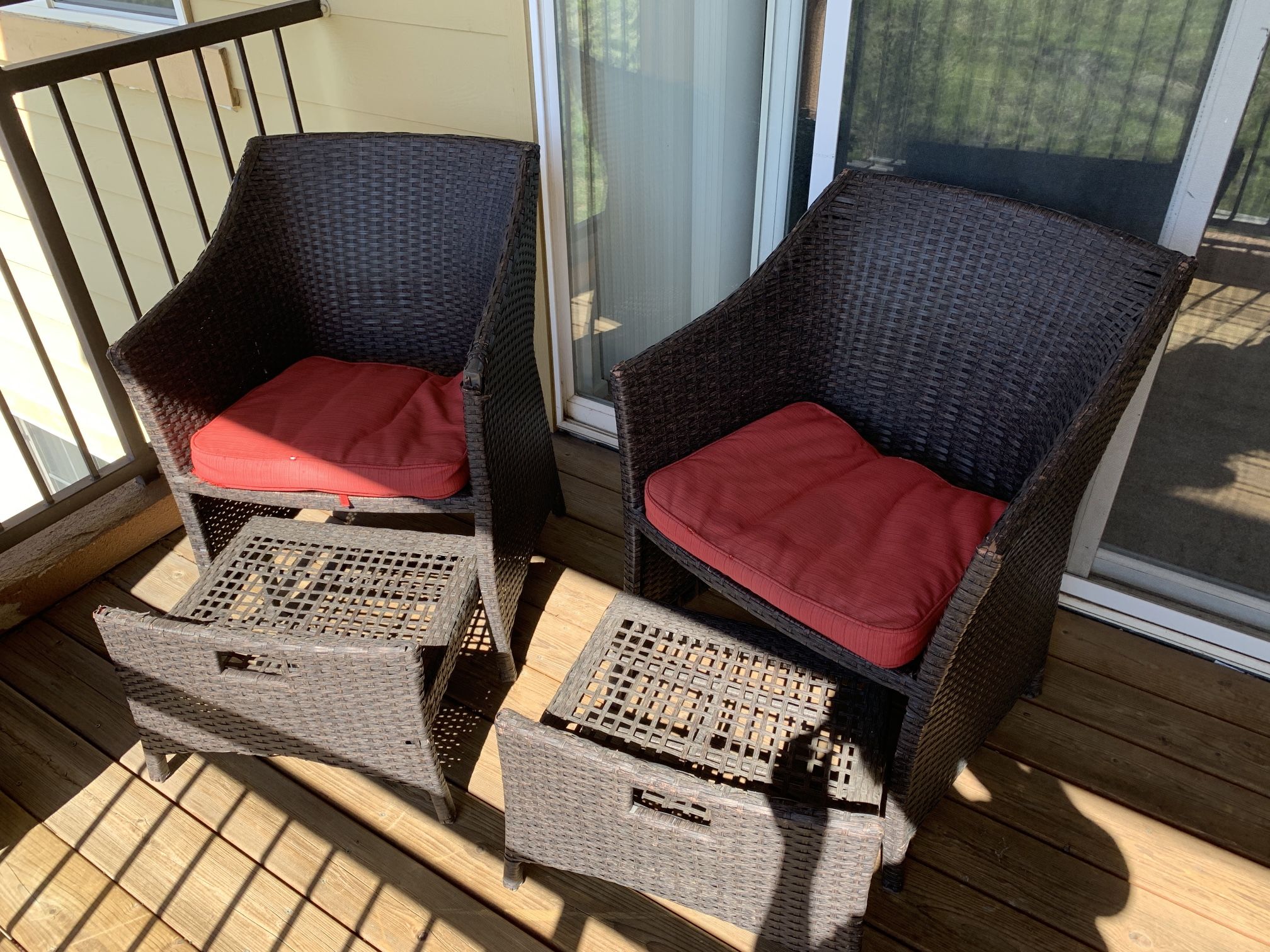 Two very comfortable patio chairs with tuck-away foot rests that can double as a side table when not in use. The cushions are in decent shape. Not overly weathered. Couple minor seam damage spots from a squirrel. The chair on the left has some minor damage to the lower left front leg and right arm rest in the front. Otherwise the set is in really good shape.