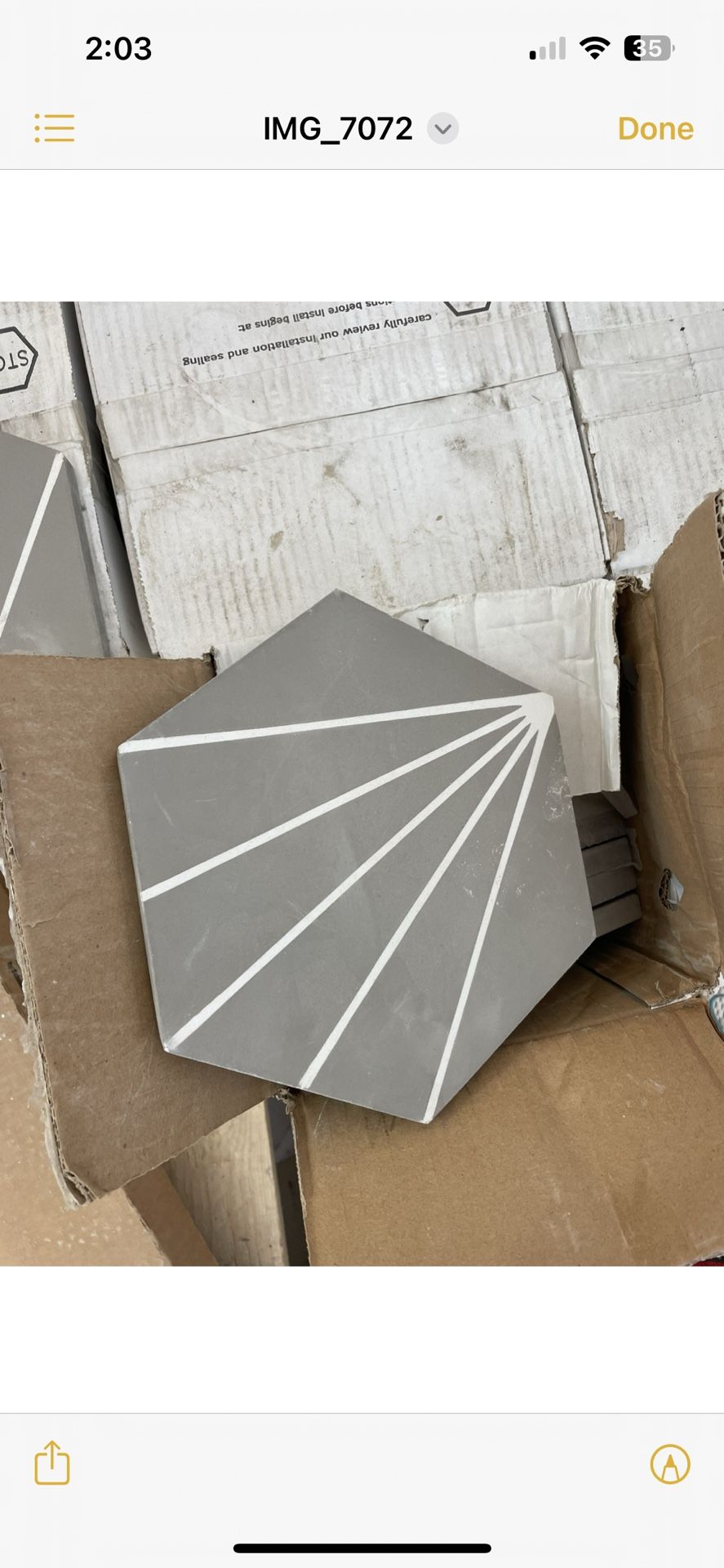 We have boxes of beautiful tile that we didnt use on our home available for sale. Basil hexagon- 39 sq feet, 9 boxes available Nautical blue and white 192 sq feet, 36 boxes Black and white Southwest 35 boxes 185 feet 3D blue tile strips 12 boxes Tera cotta square 223 feet, 43 boxes Blue and yellow star burst 20 boxes Gray spiral 8 boxes All $4-8a tile!