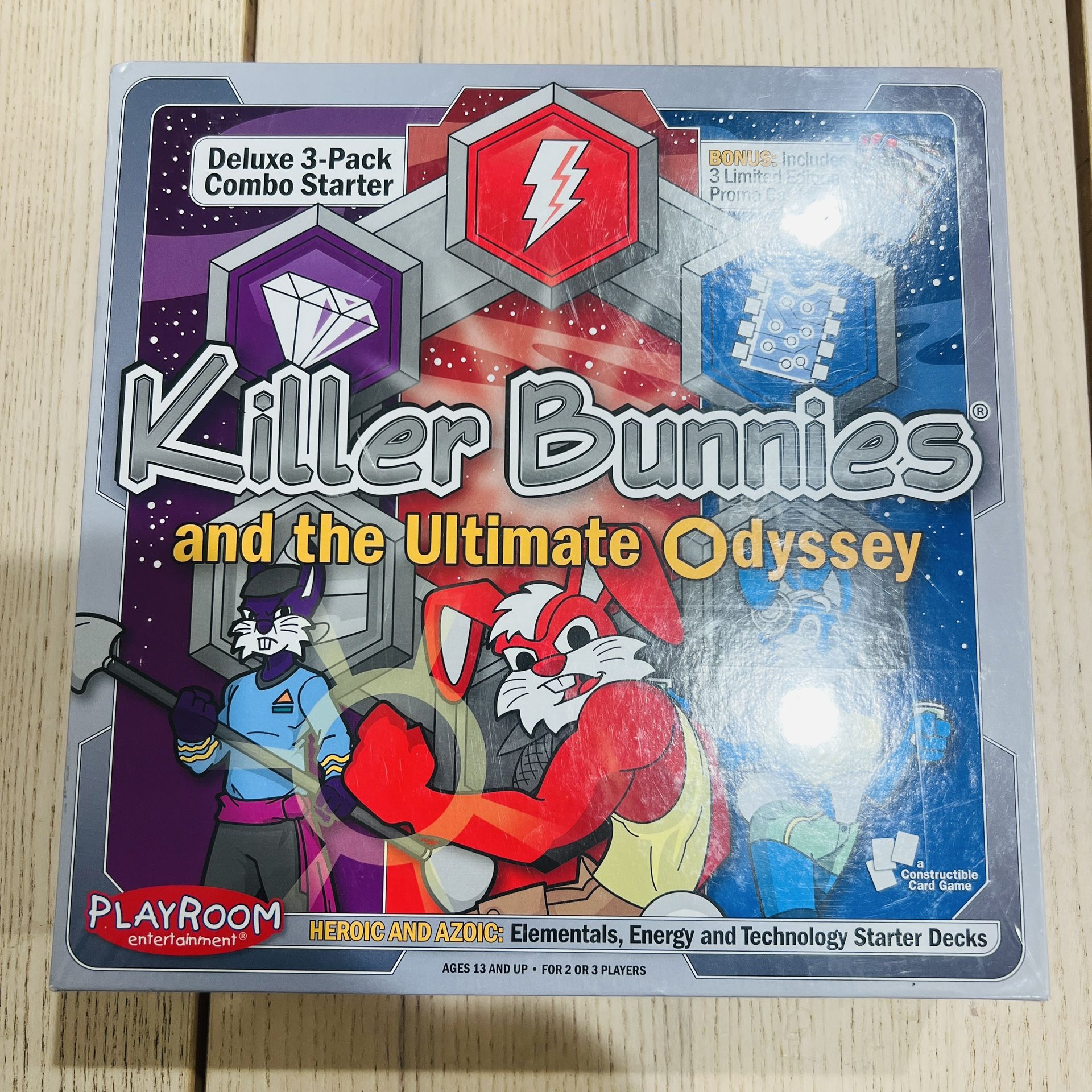 NEW Sealed !! Killer Bunnies And The Ultimate Odyssey Game PACK COMBO STARTER! The product is a pack combo starter for the Killer Bunnies and The Ultimate Odyssey game set from Playroom Entertainment. This pack includes standard-sized cards featuring killer bunnies characters in English language. It is designed for ages 13 and up and includes promotional, booster, and starter deck features that make it an exciting addition to any collectible card game collection. Perfect for fans of the Killer Bunnies franchise looking to start their own gaming adventures with this unique and engaging set. SKU GAR 7