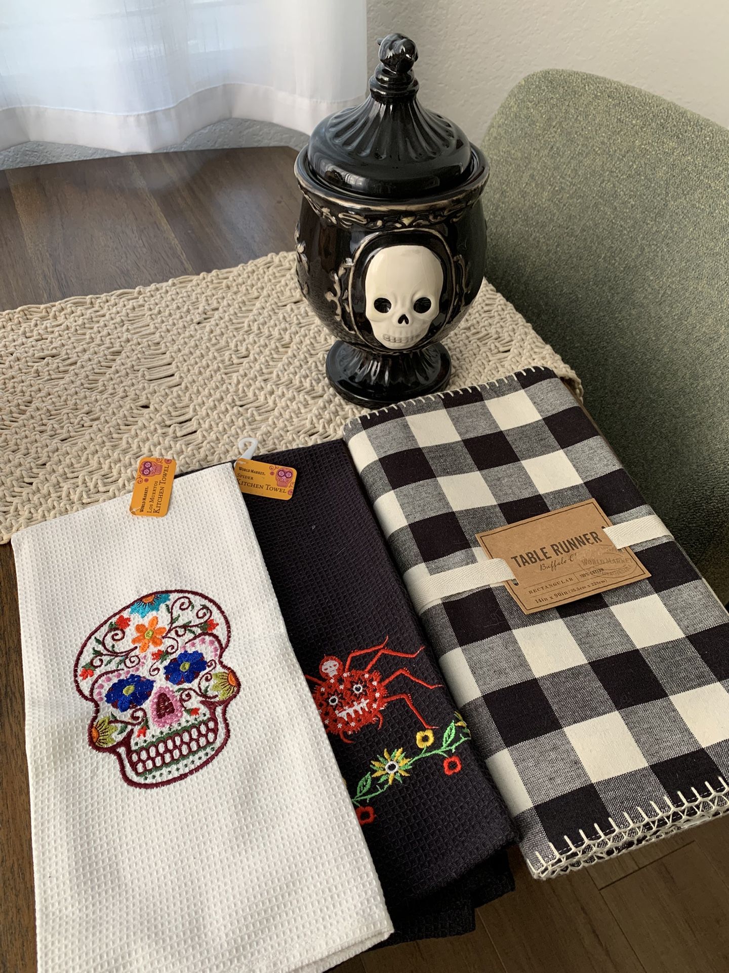 All new with tags 2 dish towels Table runner size in pic Cookie jar 12” tall