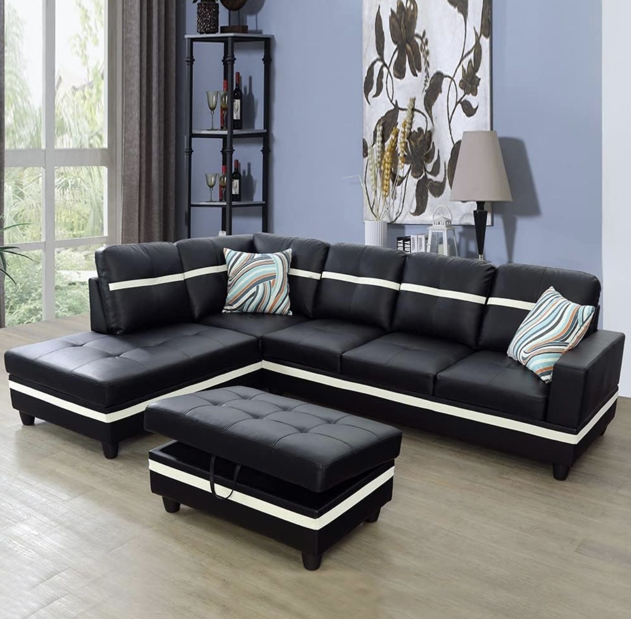 Modern Style Black Leather Sectional Couch And Ottoman