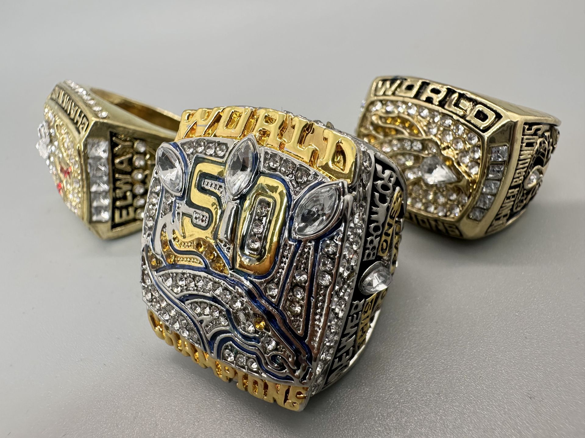 🔹 Denver Broncos Super Bowl Replica Championship Ring Set Nice collectible 3-ring set commemorating the Denver Broncos Super Bowl victories. Rings feature detailed team logos with simulated diamonds and colored stones. Includes • Super Bowl XXXII Ring (1997 Season) Size US#11 • Super Bowl XXXIII Ring (1998 Season) Size US#12.25 • Super Bowl 50 Ring (2015 Season) Size US#10.25 • Display / presentation box Details • Team: Denver Broncos • Style: Replica championship rings • Metal alloy with simulated stones • Decorative collector display box included Condition Pre-owned collectible set in good condition with light wear from handling. Stones and details appear intact. Please review photos carefully for exact condition and ring styles included. Great item for Denver Broncos fans, NFL collectors, or sports memorabilia display.