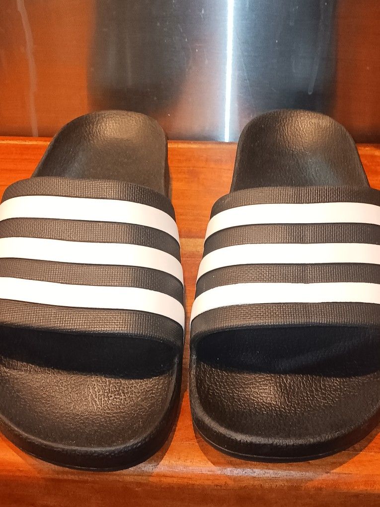 Black Adidas Adilette shower slides with white stripes. These slides feature a comfortable contoured footbed and a synthetic upper. Great for lounging or after workouts!