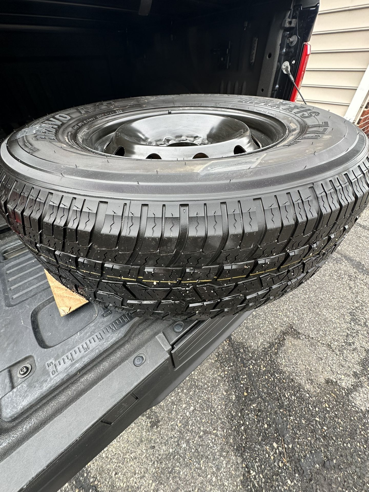 New never used. Excellent condition. This Bravo A/T Maxxis 771N, 245 75R17 112T 6x135 pattern holes tire and rim, came off my 2022 Ford F150 XLT. Rated for 55k miles. I replaced this with a bigger tire/rim. Average retail for a steel rim is $90 and the tire goes for about $150…on line research pricing.