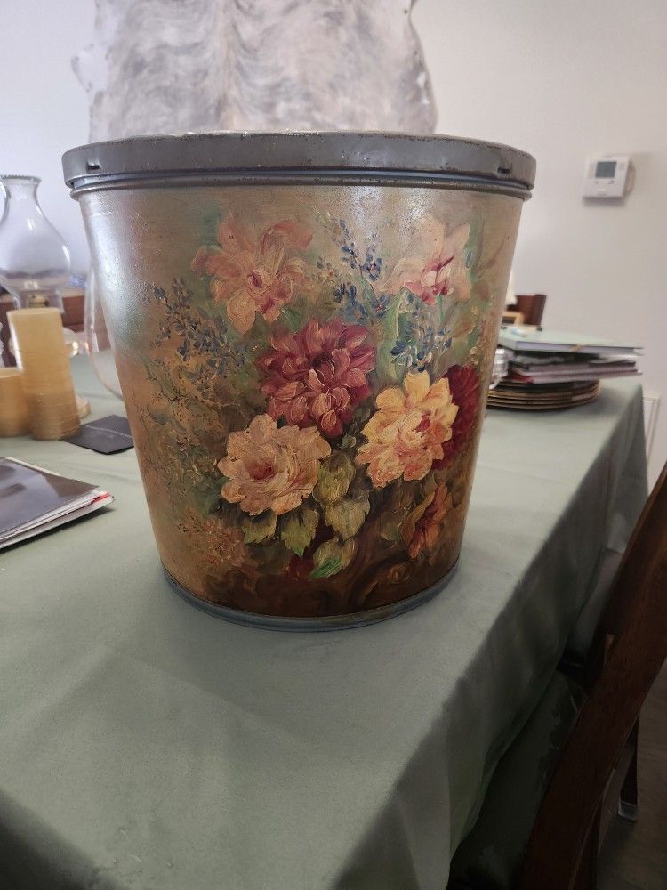 1930-40s hand painted cardboard Paper Basket with lid It's in very good used Condition