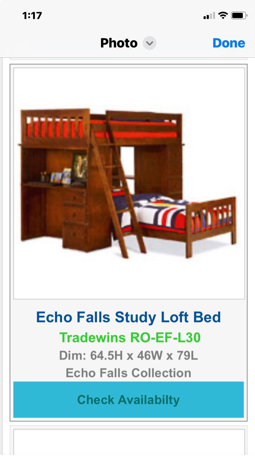 This is a used youth bunk bed with attached desk and drawer storage. Twin size. Picture is included of what the bed looks like all together. Solid wood in a brown stain. Includes small desk chair on wheels. Mattress not included. There are some minor scratches on the desk and drawers. 64.5” tall 46” wide 79” long