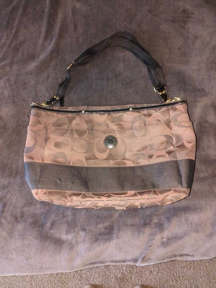 Purse is in used condition, the straps are removed (shown in photos) however there is still an adjustable shoulder strap that's attached with the ability to be removed or replaced. So the purse works fine, just doesn't have the hand carry straps. Not too dirty, just small blemishes besides that. Purse has a ton of pockets and lots of room!! Message me if you have questions. Location by Owens and Sloan