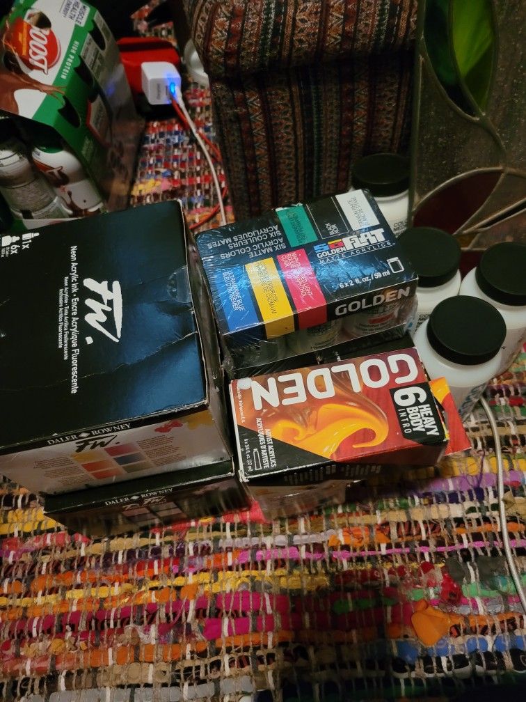 I have all these never-been-used, still-in-box art supplies that have just been sitting around, can sell as one lot or you can message me with what you are interested in. The more you buy, the cheaper they get. Available: - 1ea Golden pouring medium matte finish, 8oz - 1ea Golden intro to heavy body acrylics set - 1ea Golden Flat heavy body acrylic set - 1ea Daler-Rowney neon acrylic ink (6 colors) - 1ea Dayler-Rowney pearlescent acrylic ink set (6 colors)