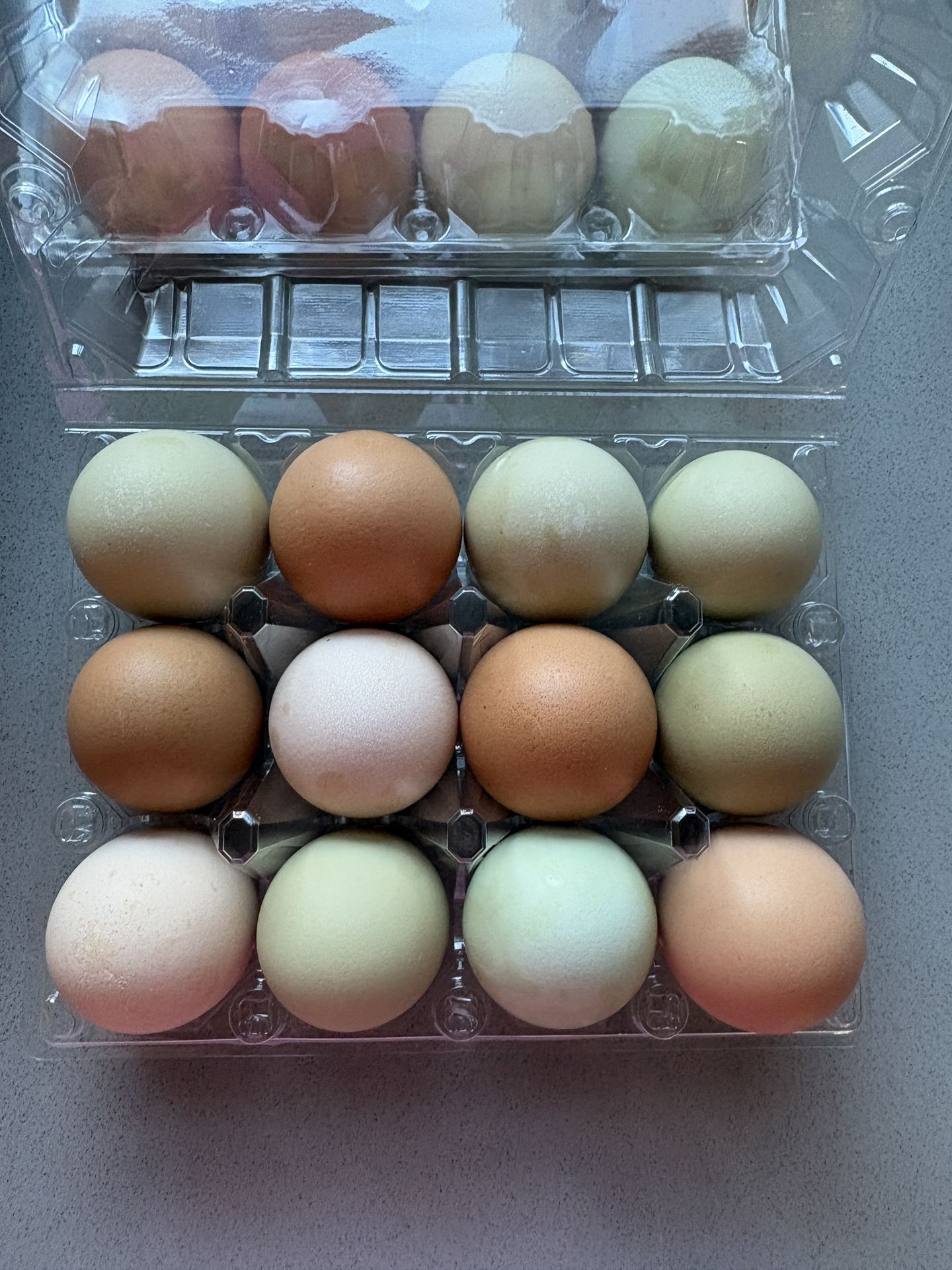 Fresh pasture raised chicken eggs, assorted color, $7 per Dozen. Pick up in Des Moines only.
