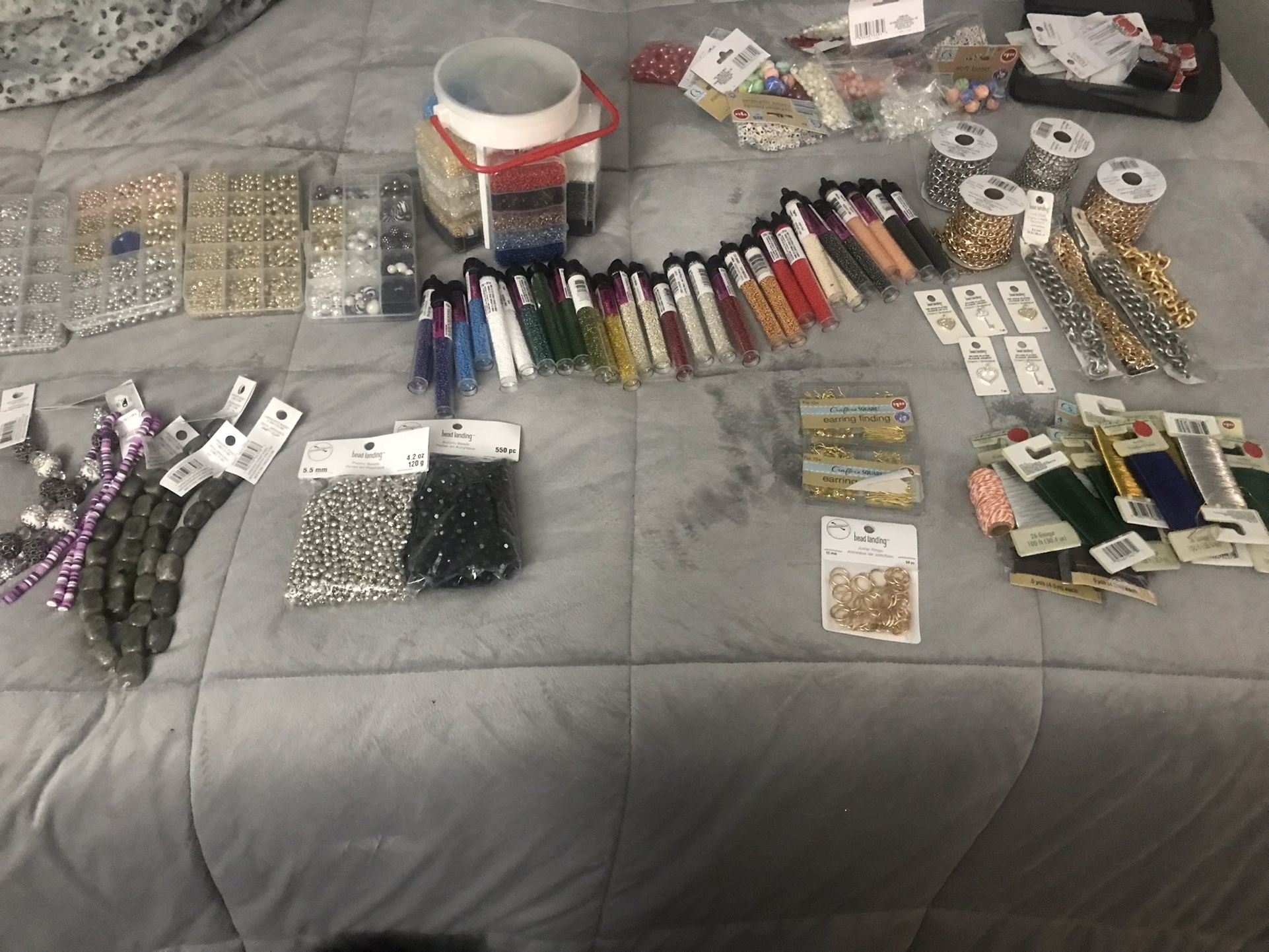 This is a lot of beads and jewelry making items and supplies that are new except for a little of the chain from me trying to start making jewelry but just has sat and I need to make room in my crafting area so it’s priced to sell!!!!! Most of the items are from Michael’s with the exception of the small pile in the back from dollar tree. I literally had no clue beading etc was so expensive!! So this is a killer deal. My loss is your GAIN!!! Meet in Auburn