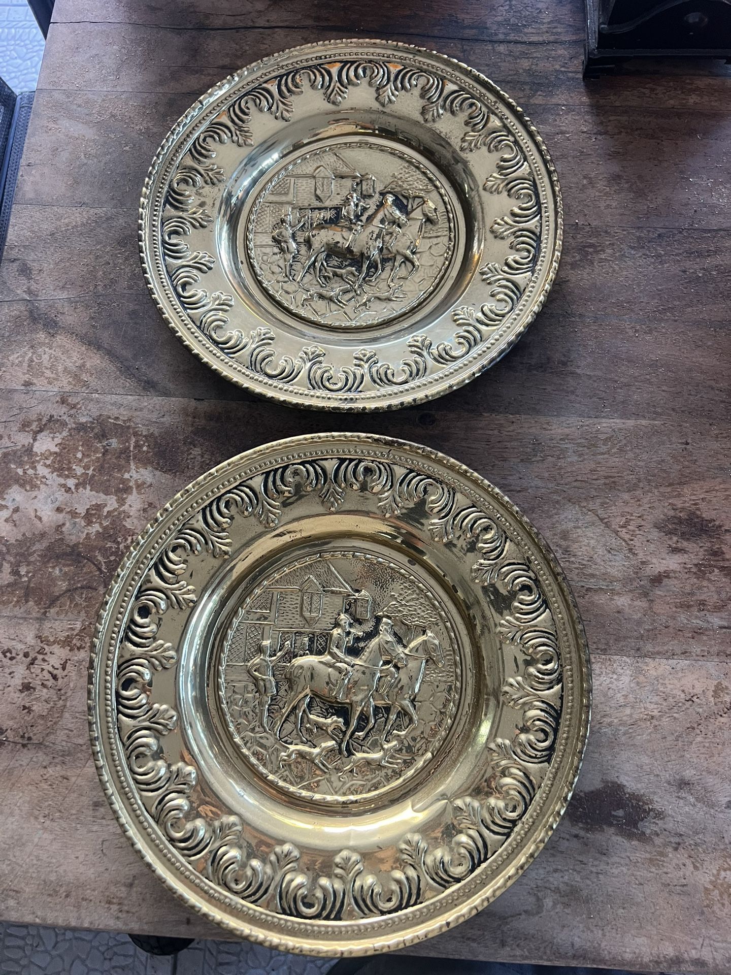 Fox Hunt Hunting Pair of Riders Old Town Medium Brass Wall Hanging Plate Set