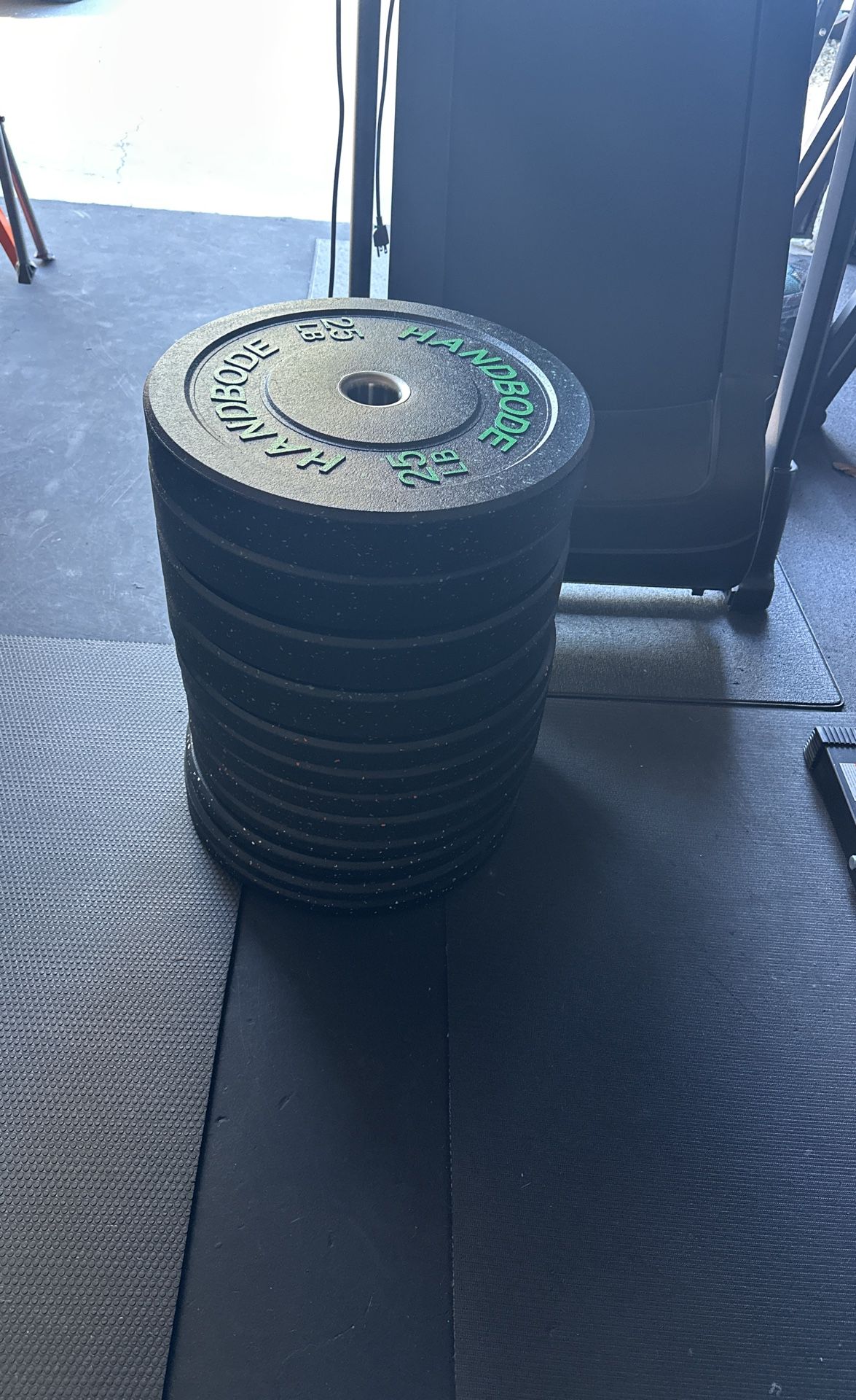 Barely used. New condition Sold all together. I have a few Olympic bars if needed. 25-4 15-4 10-4