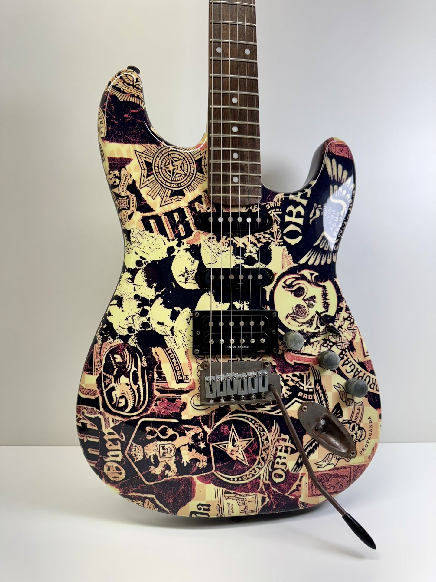 Fender Squier OBEY STRATOCASTER Custom Graphic Solid Body Electric Guitar. Nice and cool looking guitar with that factory distressed details, yes that’s factory made like that. Like new condition. Available for purchase at The Thrift Shop Village in Hayward, California.