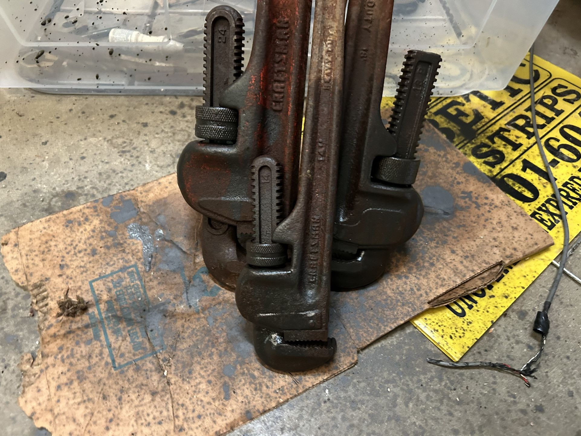 Tools. In good condition. Pipe wrenches, one each 24 inch one each 16 inch and 1 12inch.