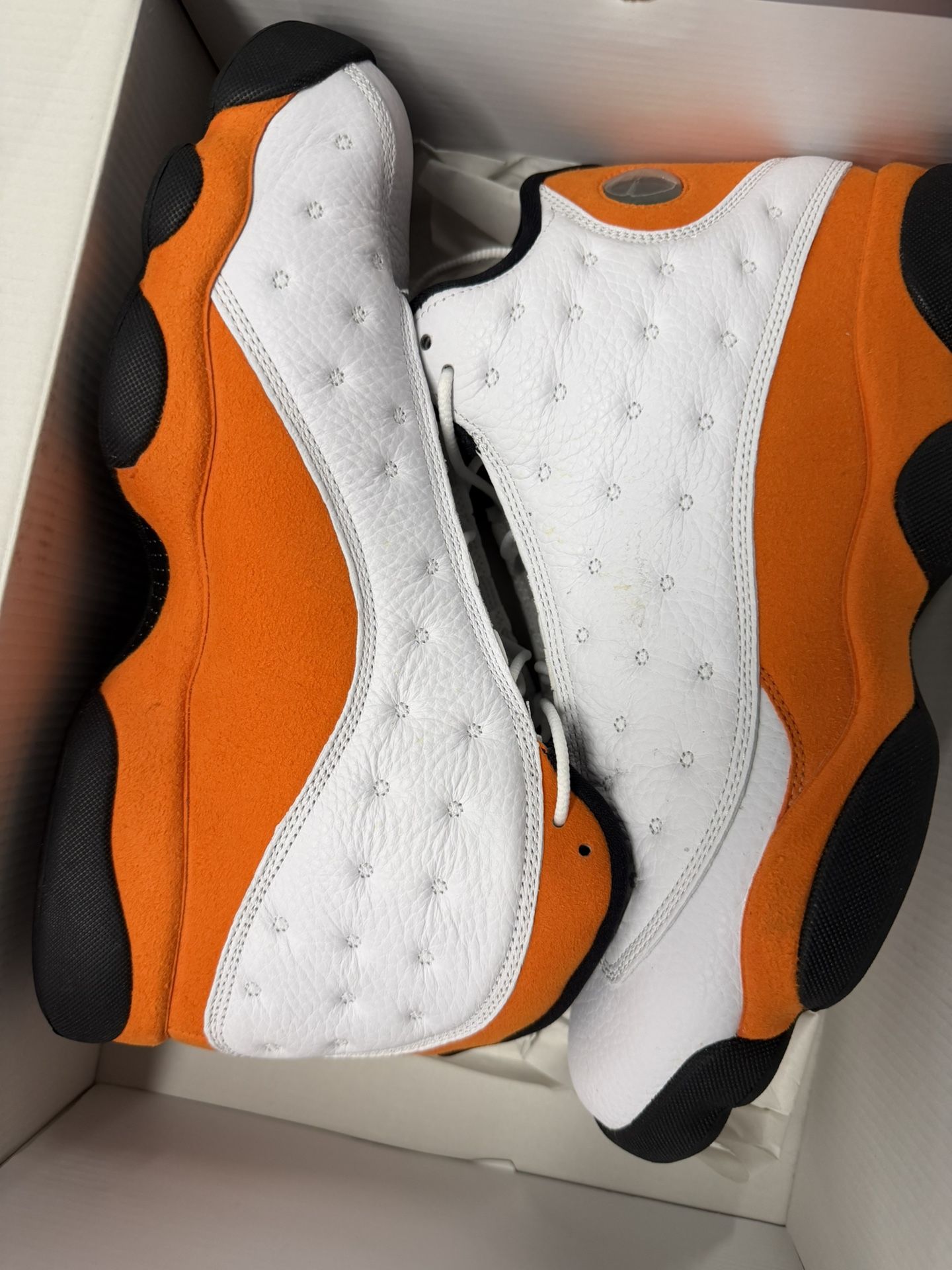 The Air Jordan 13 Retro ‘Starfish’ features a familiar color palette that recalls the ‘Shattered Backboard’ editions of the Air Jordan 1. The upper combines a white tumbled leather base with orange suede paneling and signature dimpled overlays in more white leather. Traditional branding elements include an embroidered Jumpman atop the tongue and the 13's holographic eye on the lateral ankle. A contrasting black finish is applied to the panther-paw outsole. Only worn once, wrong size for me