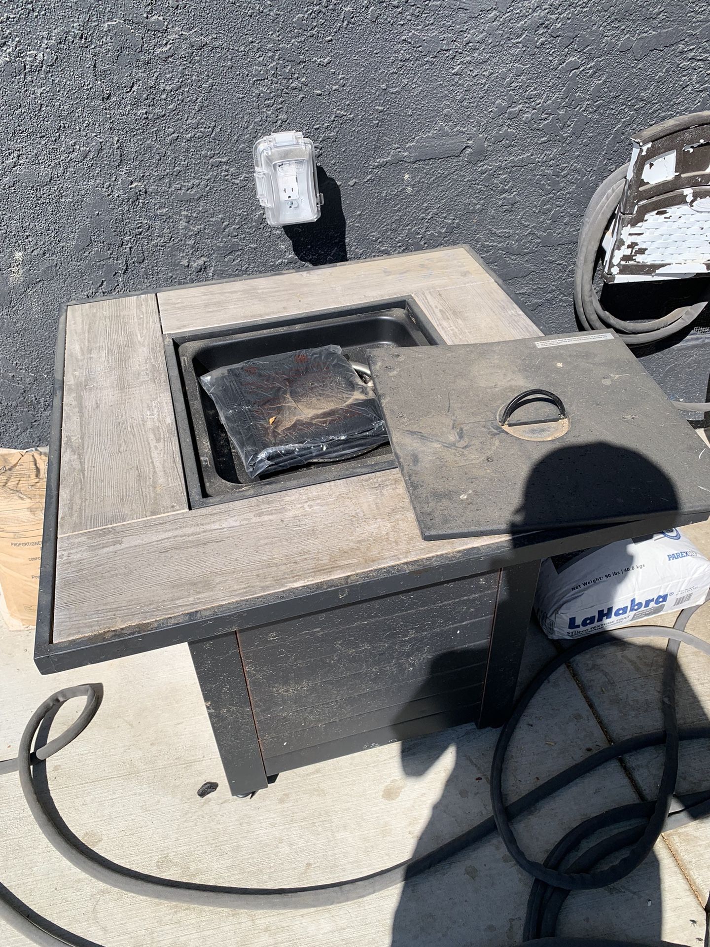 Elevate your outdoor living space with this masterfully created dual mantel fire pit that allows for two different mantel looks in one. Choose between pebble grey or walnut brown interchangeable ceramic wood tiles to ensure your fire pit compliments your outdoor furniture. Finished in an oil rubbed bronze, the weather resistant stamped steel base discreetly hides the propane tank and the electronic igniter. The steel table insert that covers the fire bowl can be hung on the outside panel when the fire pit is in use. The 50,000 BTU stainless steel burner with an automatic shut off safety device makes this fire pit the ideal companion for those chilly nights. Weather resistant all steel base in an oil rubbed bronze finish 50,000 BTUs stainless steel burner thermocouple safety feature automatically shuts off gas flow Hide-away insert storage Hidden control panel with an easy push-and-turn electronic ignition Black fire glass, protective cover and adjustable feet included