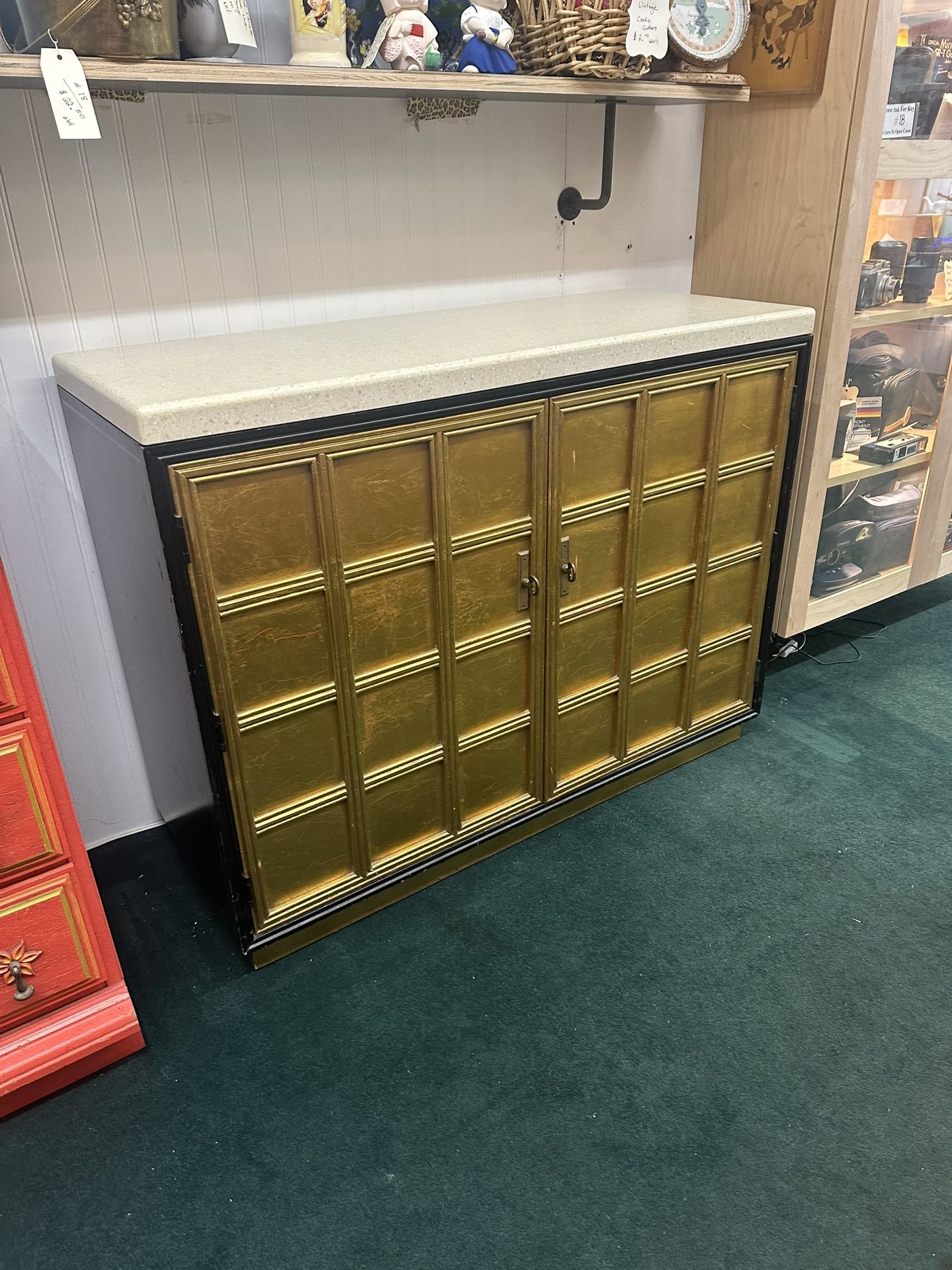 Vintage credenza/ gaming center/ entry table/ bar, etc. painted black wood with gold leaf painted doors with brass handles and a new Corian top. Has some wear but in good condition. The measurements are - 39.75” Wide x 16” Deep x 30.75” Tall Located in - Main Street Antiques 208 E. Main Street Turlock, Ca. 95380 In booth 18. Ask for #18, there are two locations for 18 in this store. Price is $195.00 Plus Tax.