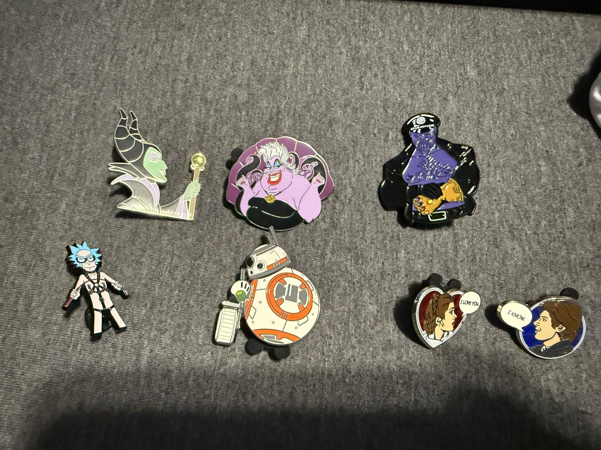 Selling a small lot of 7 collectible trading pins. Includes Disney villains and Star Wars characters plus one Rick and Morty pin. Characters include Maleficent, Ursula, BB-8, Princess Leia, Han Solo, and more. Great for collectors or for trading at Disney parks. Pins are in good condition and have been stored safely. • 7 pins total • Disney & Star Wars characters • Great for collectors or trading • Selling as a bundle $25 or best offer. Pickup available.