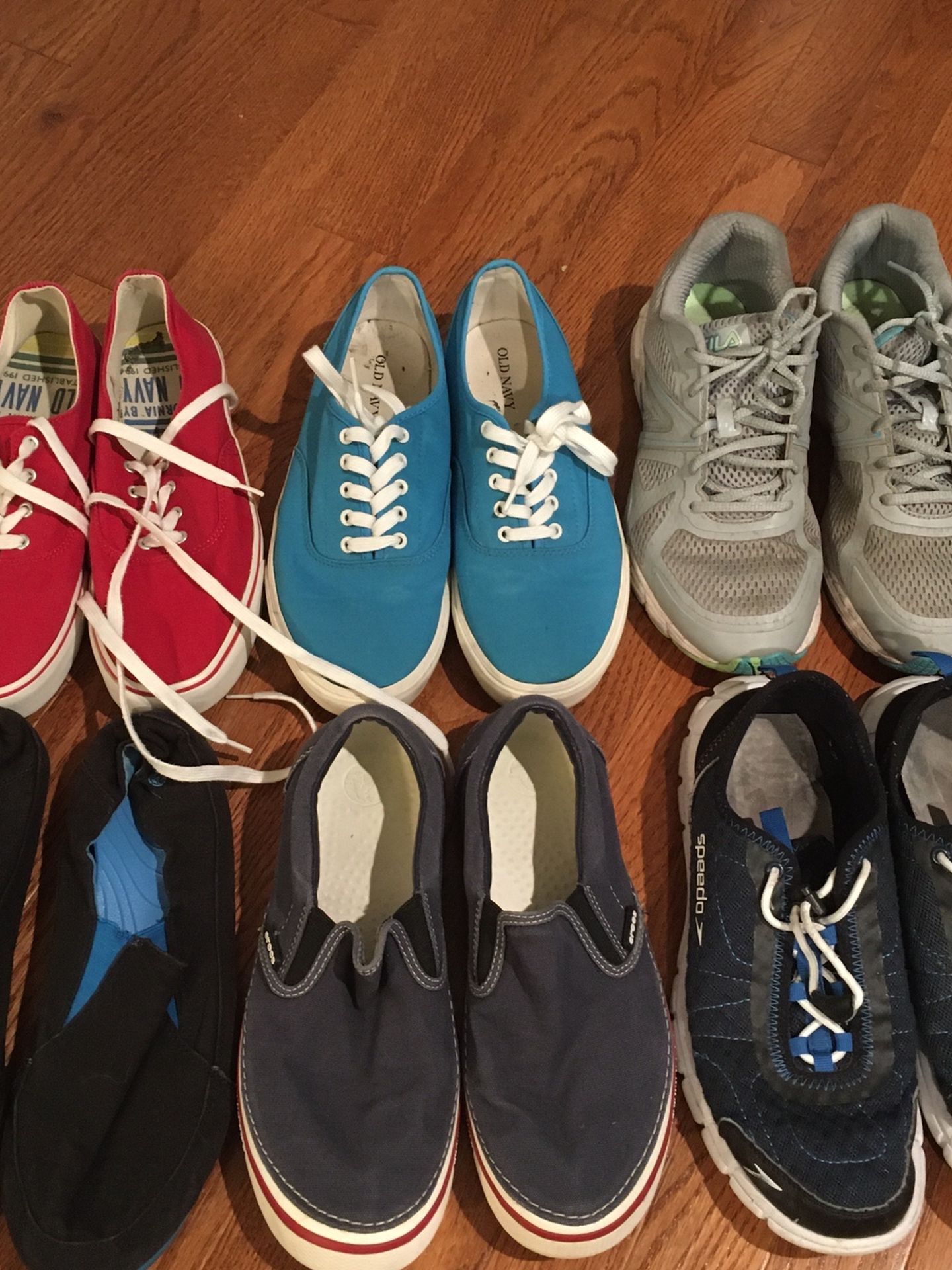 Hello, I’m moving and selling these. Red and blue old navy shoes are like new, only worn a few times. Fila Grey shoes, crocs navy blue, speedo blue, and slippers. I’ll wash all with Clorox 2 before you come, they’ll be clean and sanitized. I know buying used shoes can be worrisome. I’m a very clean person, obsessively clean. I guarantee these will be thoroughly sanitized and ready for use.