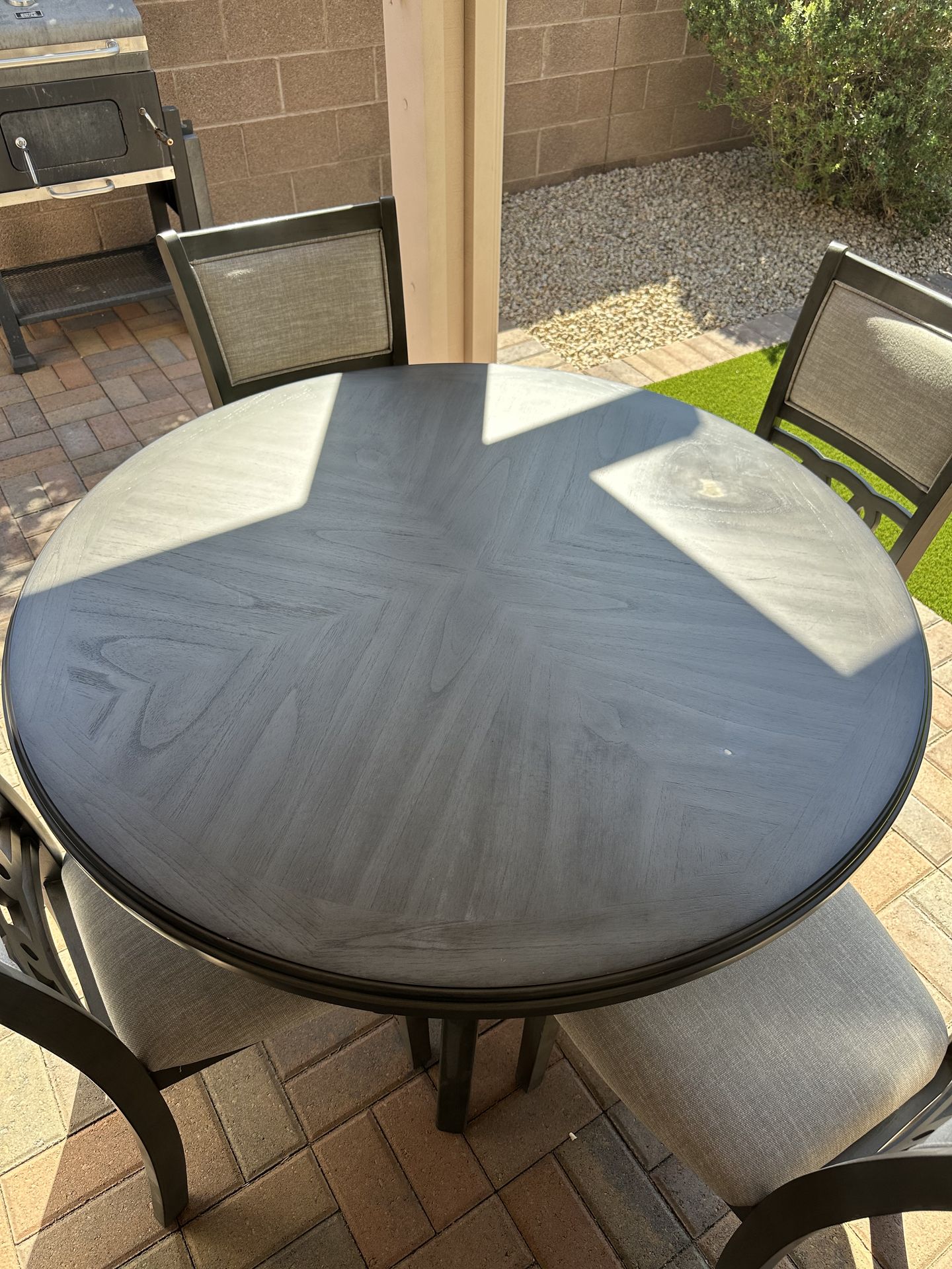 This popular table for smaller spaces has two spots of damage (see pics on the table surface.) but otherwise in extremely clean condition. Table cover provided that matches the color. Perfect for a DIY project.