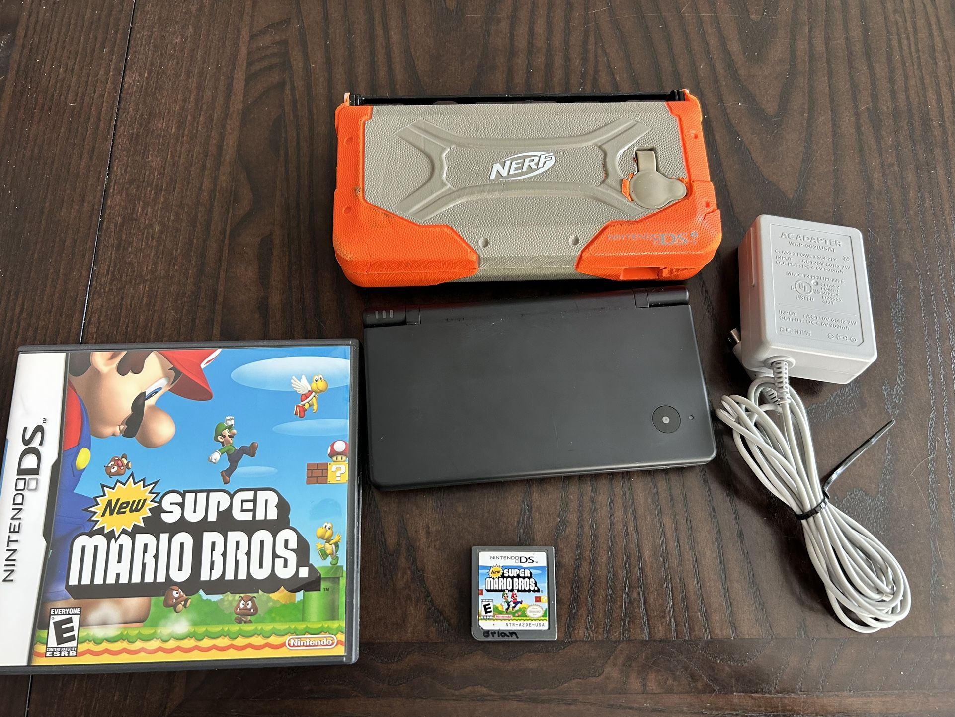 excellent condition Nintendo DSi black color Handheld Console Game System charger, and Nerf case with new super Mario Bros game
