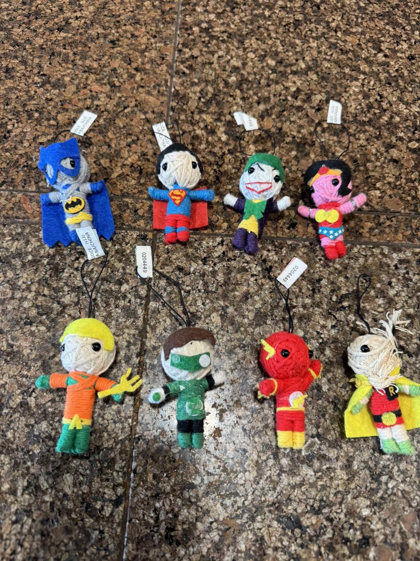 8 DC comic string voodoo dolls. Robin, Flash, Joker, Green Lantern, Batman, Aquaman, Wonder Woman and Superman. Robin string on his head. Got a little messed up as you can see in the pictures. Otherwise all the other ones still have their original tags and are in great condition. Would also make cute little Christmas ornaments. $15 for all