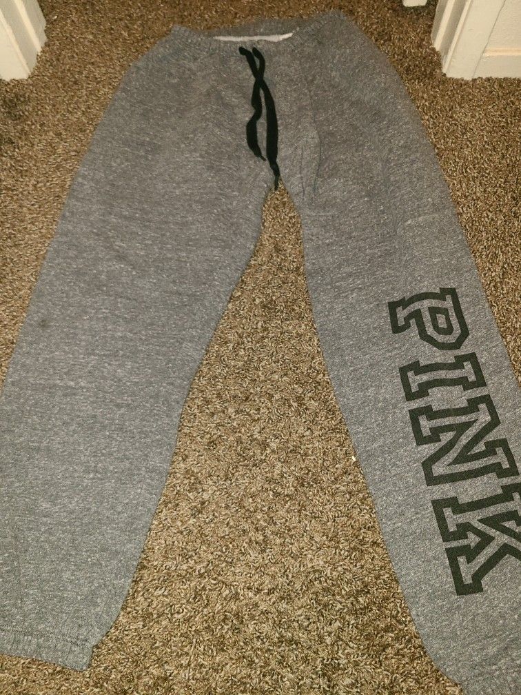 Pink grey sweatpants, a couple dark spots on the left leg shown in the picture
